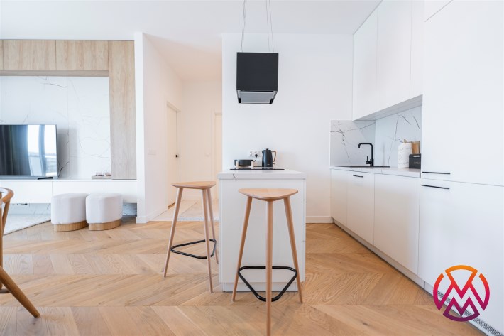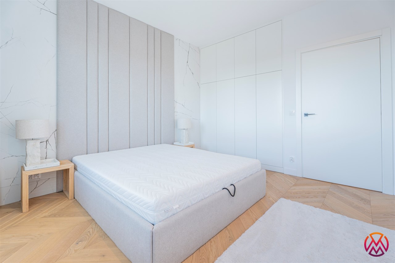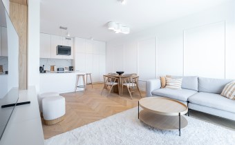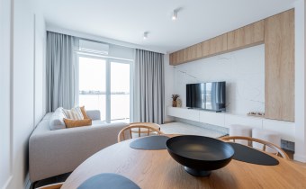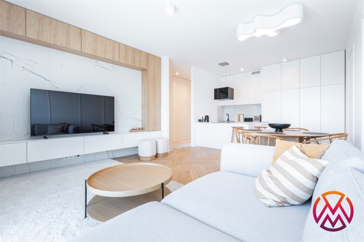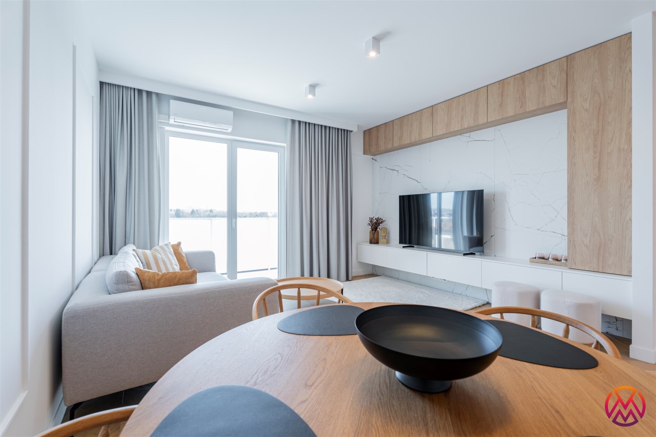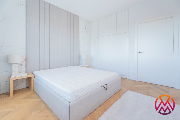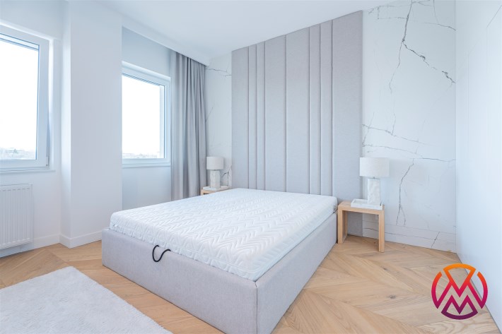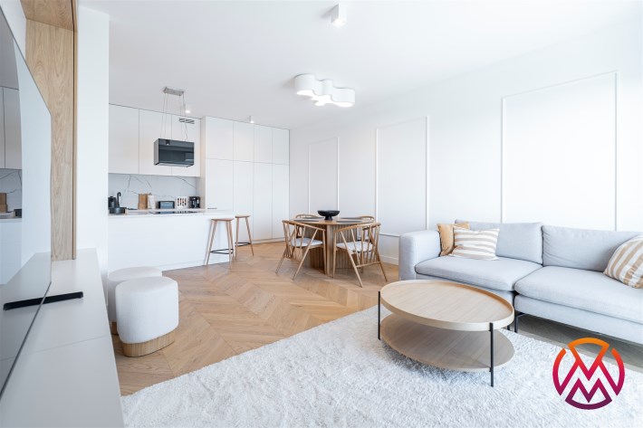 W pełni umeblowane - w salonie znajdziemy komplet wypoczynkowy, stolik kawowy, szafkę RTV, TV oraz stół z krzesłami. Funkcjonalna kuchnia wyposażona została we wszystkie niezbędne sprzęty - lodówko-zamrażarkę, zmywarkę, płytę indukcyjną, piekarnik elektryczny, okap, wyposażenie drobne. Salon klimatyzowany. W sypialni znajdziemy wygodne, małżeńskie łóżko z materacem, szafki nocne oraz pakowną szafę w zabudowie. Łazienka wyposażona w prysznic, toaletę, umywalkę z szafką, pralkę.