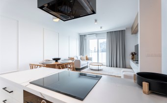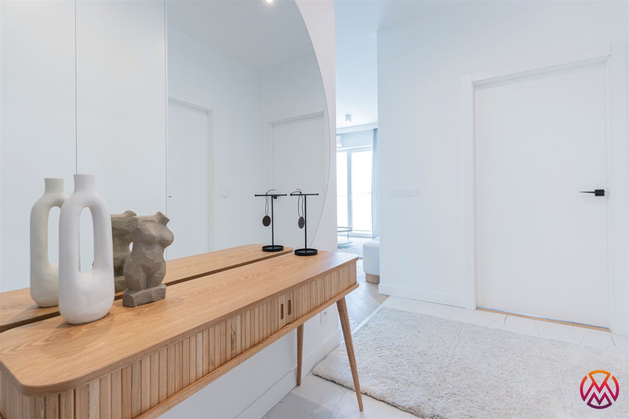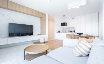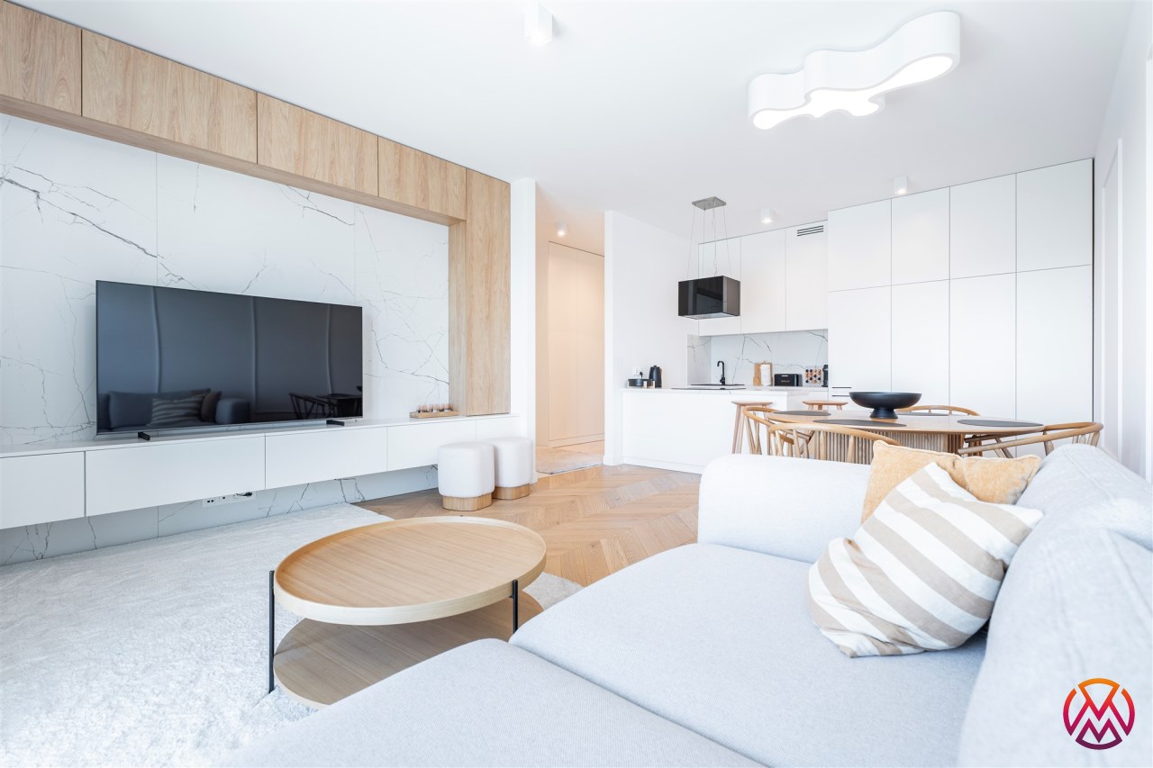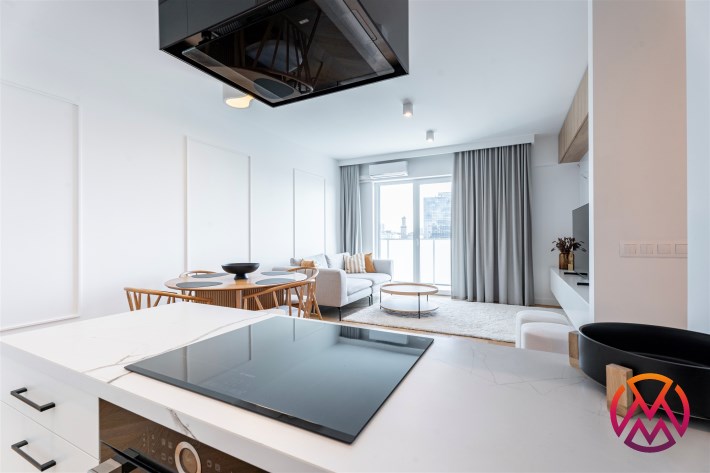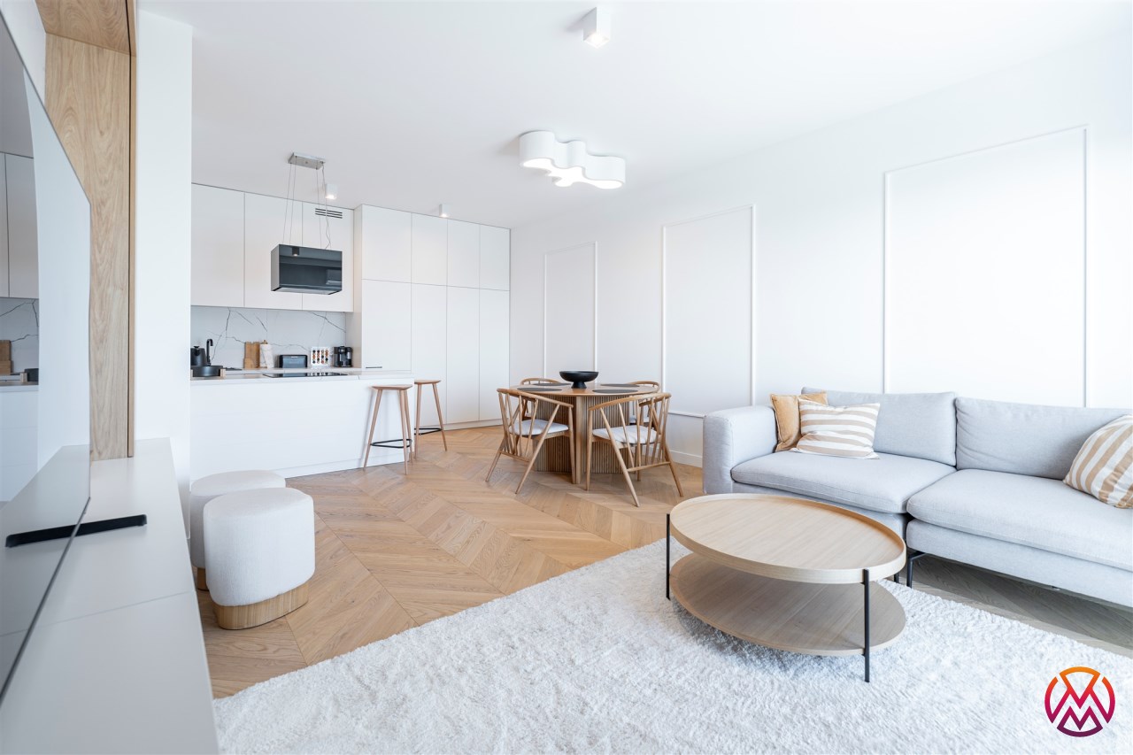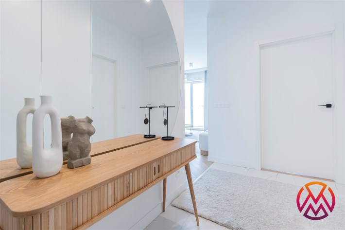W pełni umeblowane - w salonie znajdziemy komplet wypoczynkowy, stolik kawowy, szafkę RTV, TV oraz stół z krzesłami. Funkcjonalna kuchnia wyposażona została we wszystkie niezbędne sprzęty - lodówko-zamrażarkę, zmywarkę, płytę indukcyjną, piekarnik elektryczny, okap, wyposażenie drobne. Salon klimatyzowany. W sypialni znajdziemy wygodne, małżeńskie łóżko z materacem, szafki nocne oraz pakowną szafę w zabudowie. Łazienka wyposażona w prysznic, toaletę, umywalkę z szafką, pralkę.