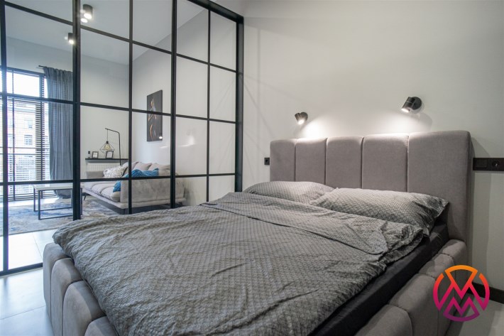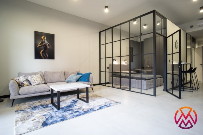 Apartament składa się z 2 pokoi, funkcjonalnie zaplanowanych - przestronnego salonu z aneksem kuchennym z wydzieloną, wydzielonej szklanymi ścianami sypialni, łazienki razem z WC oraz hallu. Mieszkanie posiada duże okna na całą wysokość ściany - dobrze doświetlone, strona wschodnia.