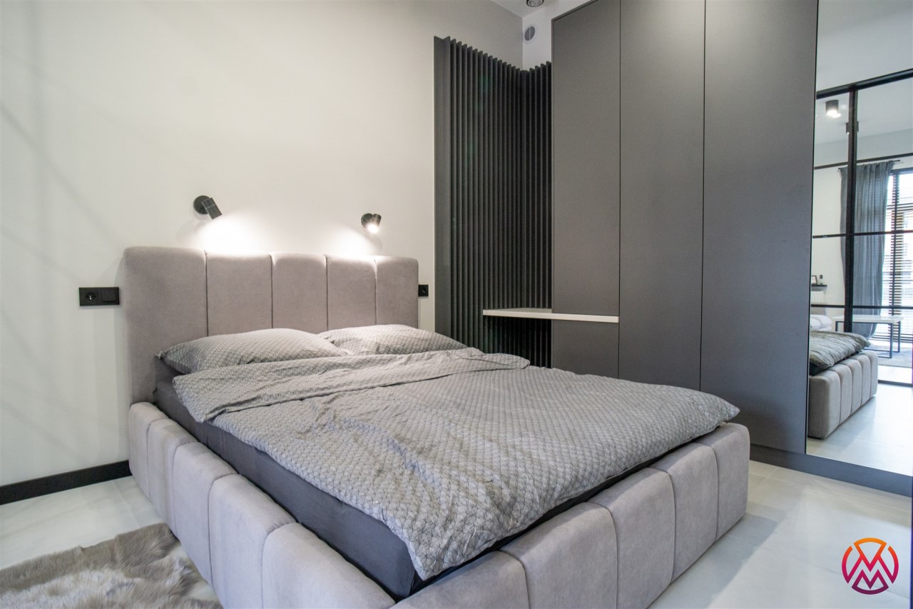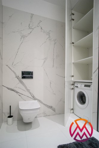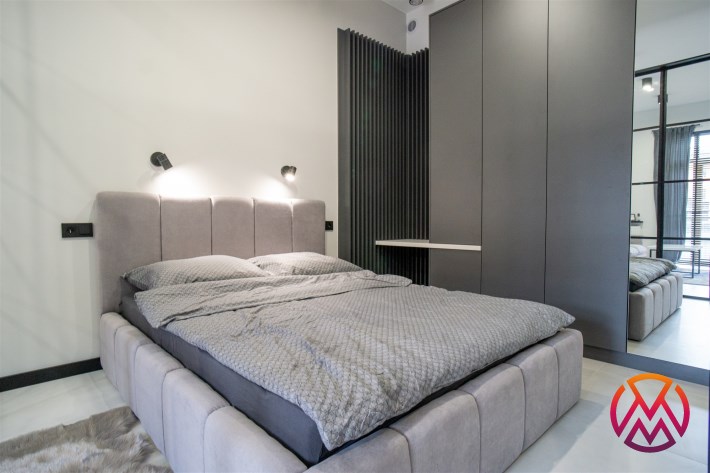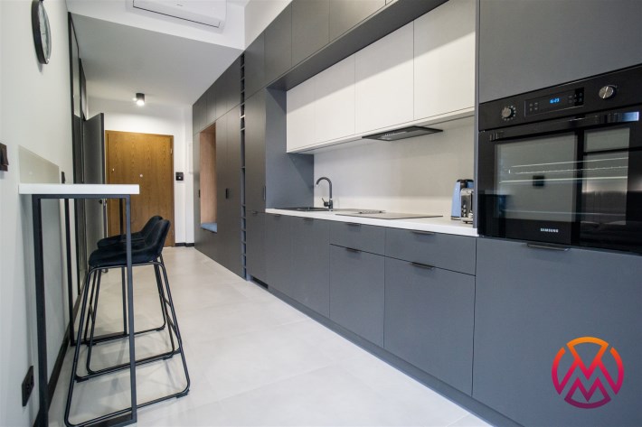 W pełni umeblowane. Kuchnia wyposażona we wszystkie niezbędne sprzęty wysokiej jakości - lodówkę z zamrażarką, płytę indukcyjną, zmywarkę, piekarnik, zlewozmywak z baterią oraz zabudowę kuchenną, a także komplet naczyń i sztućców. W salonie znajdziemy wygodny komplet wypoczynkowy, TV, stolik kawowy. W sypialni podwójne łóżko, szafa oraz toaletka. Przestronna łazienka została wyposażona w prysznic, pralkę, WC oraz umywalkę. W przedpokoju znajdziemy pakowne szafy w zabudowie.