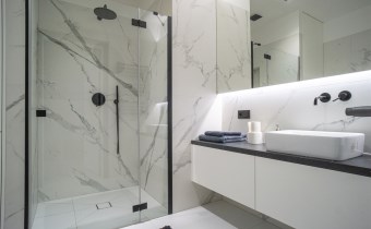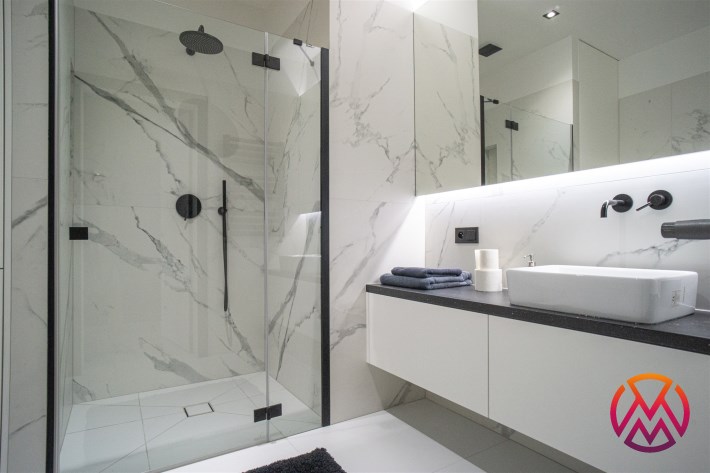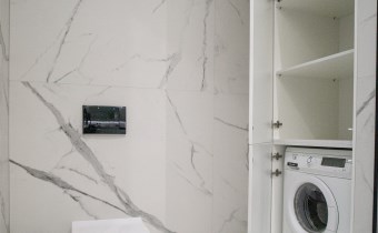 Wyposażenie łazienki kabina prysznicowa, lustro, pralka, umywalka, WC