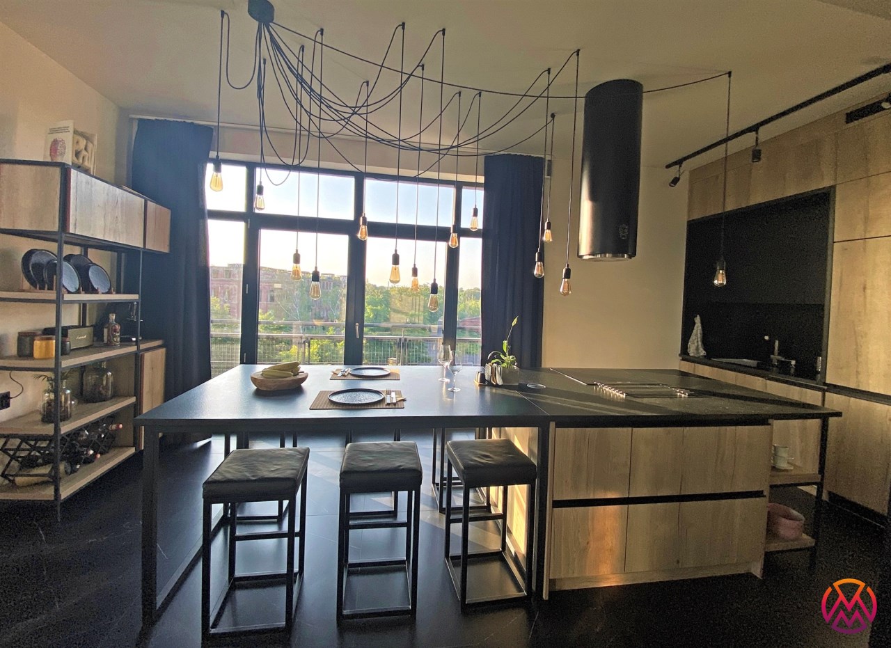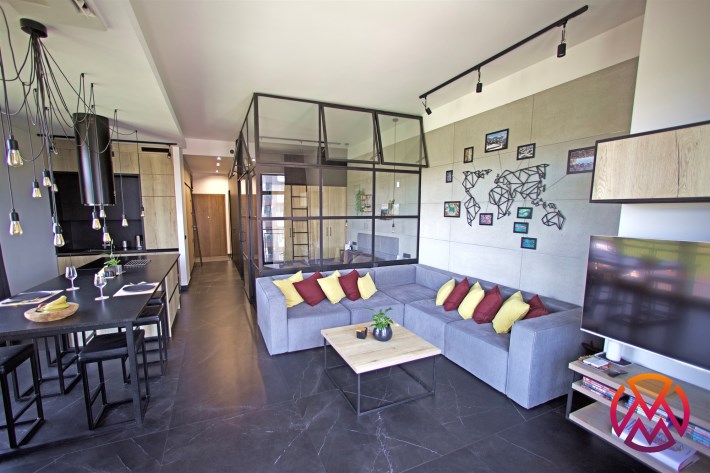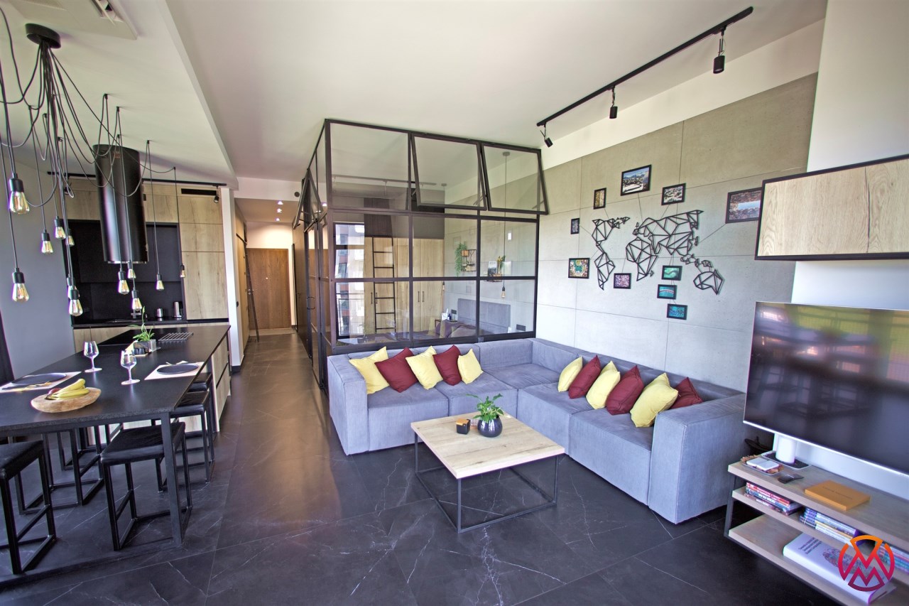 Salon wyposażony został w komfortową sofę, stolik kawowy, szafkę RTV i TV. Aneks kuchenny posiada wszystkie niezbędne sprzęty: lodówkę z zamrażarką, zmywarkę, płytę i piekarnik, okap, ekspres ciśnieniowy oraz wyspę kuchenną z hokerami. Całość nowoczesna, wykończona z wysokiej jakości materiałów, zaaranżowana przez architekta wnętrz. Lokal nowoczesny, estetycznie urządzony, w wyjątkowym klimacie słynnych loftów na Tymienieckiego.