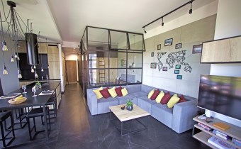 Apartament o powierzchni ok. 62 m2 składa się z salonu z aneksem kuchennym, wydzielonej sypialni, przedpokoju, kuchni oraz łazienki. Dodatkowo wyposażony jest w klimatyzację oraz elektryczne zasłony zaciemniające.