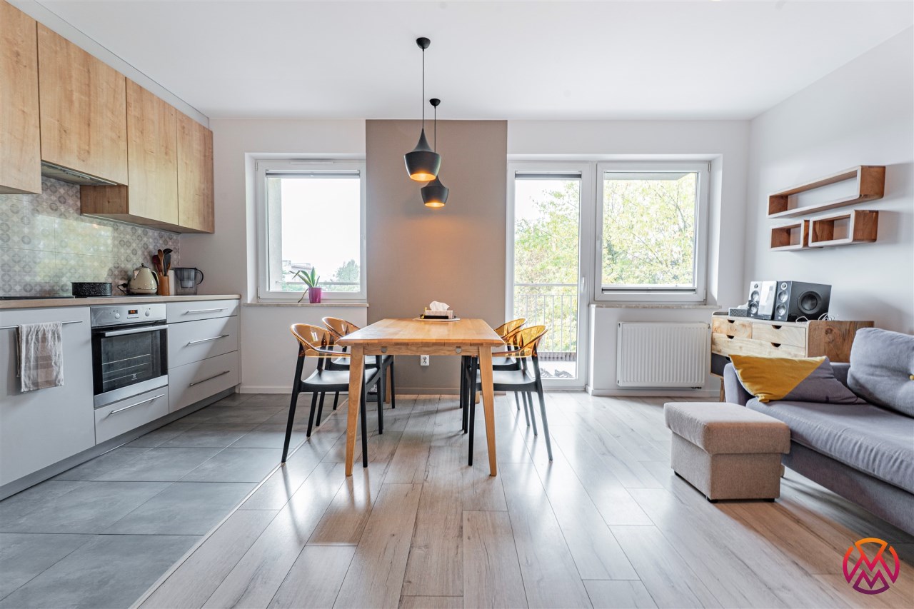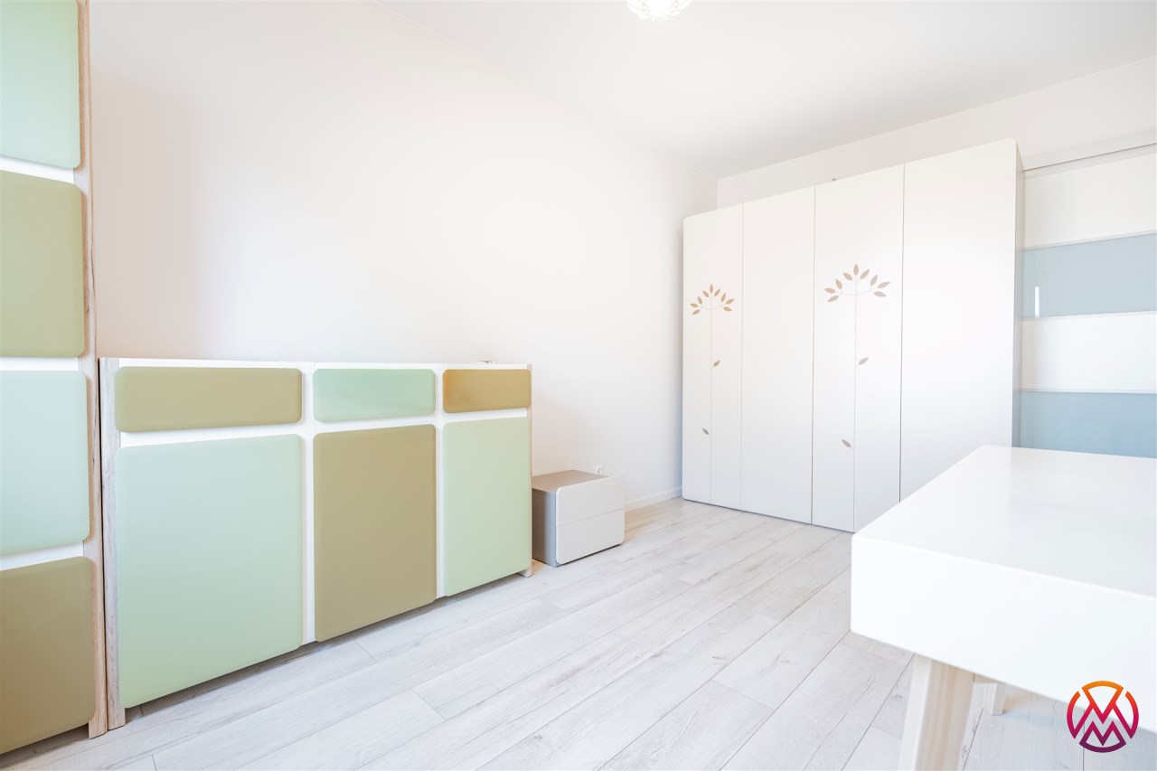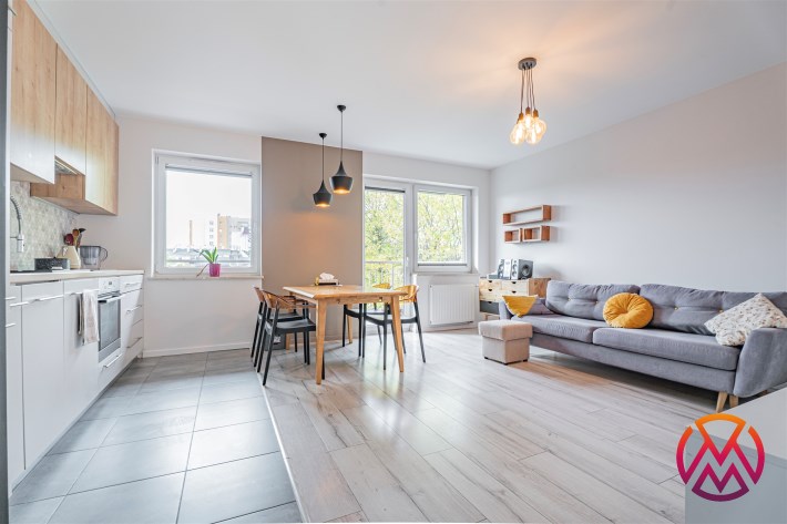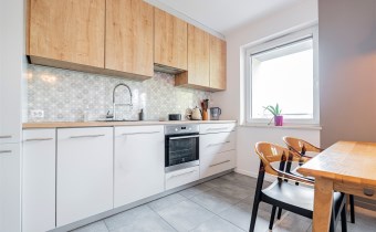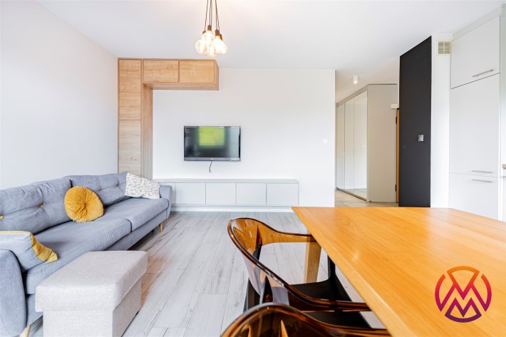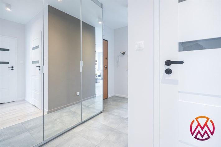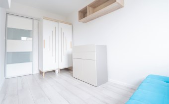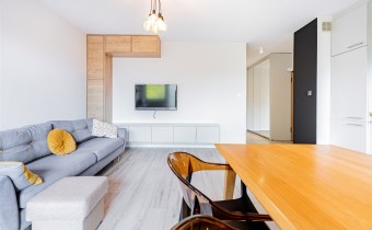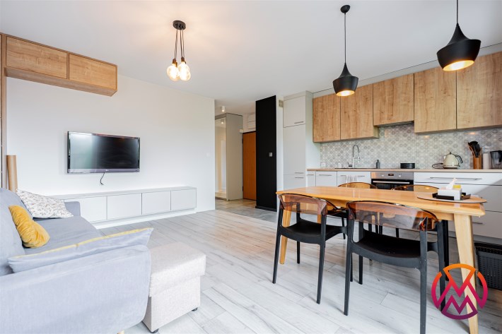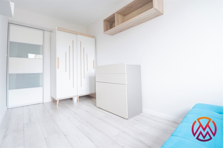 W salonie kanapa z funkcją spania, stolik, stół z krzesłami, szafka RTV oraz TV. Dodatkowo wyjście na duży balkon z widokiem na zieleń. Przy salonie aneks kuchenny, wyposażony w we wszystkie niezbędne sprzęty i meble. Wszystkie sprzęty (lodówka z zamrażarką, piekarnik, płyta indukcyjna, zmywarka) w bardzo dobrym stanie. Salon bardzo przestronny i dobrze nasłoneczniony. Sypialnia główna wyposażona w podwójne łóżka oraz szafę i komody. W drugiej sypialni znajdziemy rozkładaną kanapę oraz szafę. Łazienka przestronna, wyposażona w kabinę prysznicową z deszczownicą. Dodatkowo ogromne lustro, WC, umywalka i pralka. Łazienka urządzona w stylu komponującym się z resztą mieszkania. Dodatkowo oddzielne WC z umywalką. W przedpokoju funkcjonalna, duża szafa.