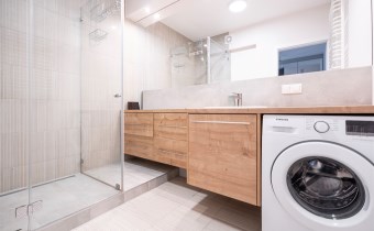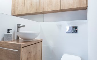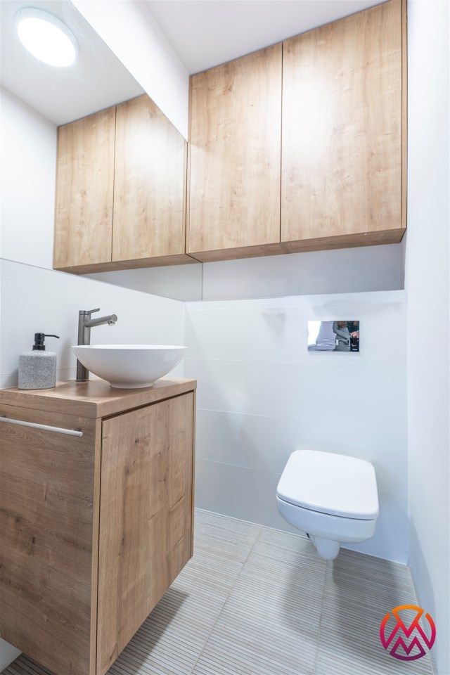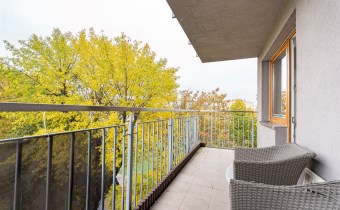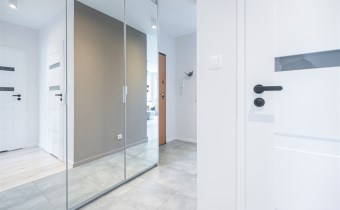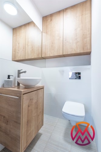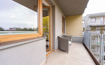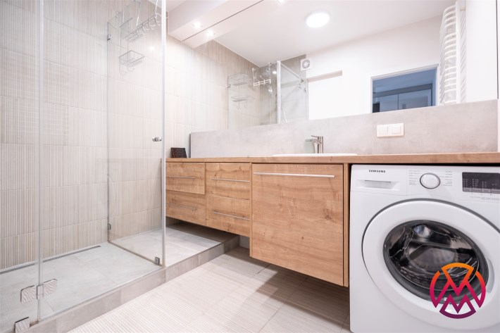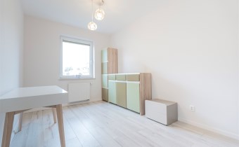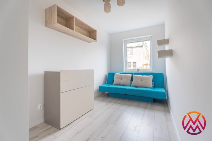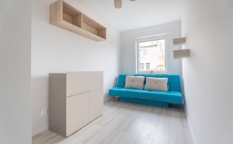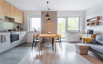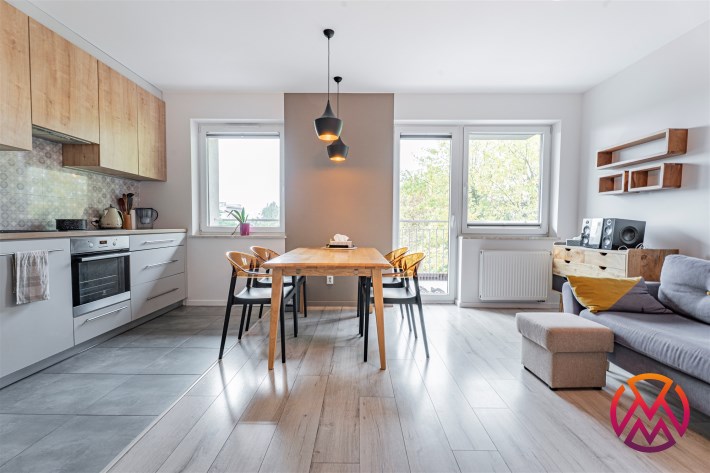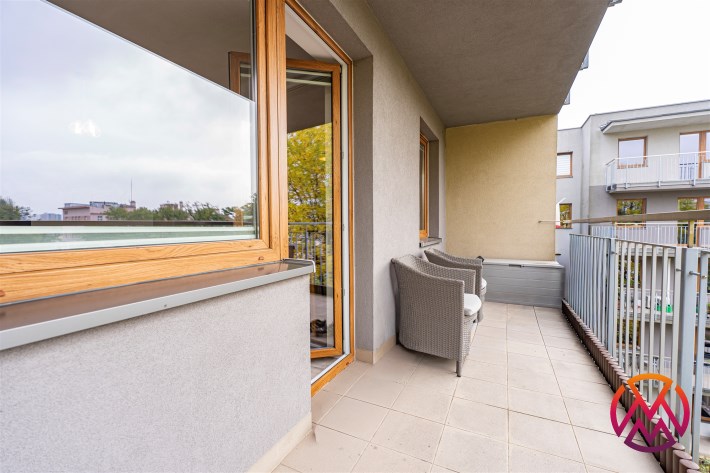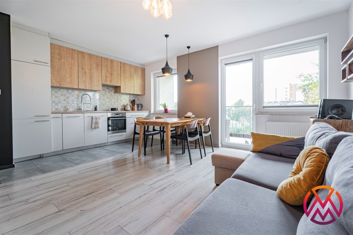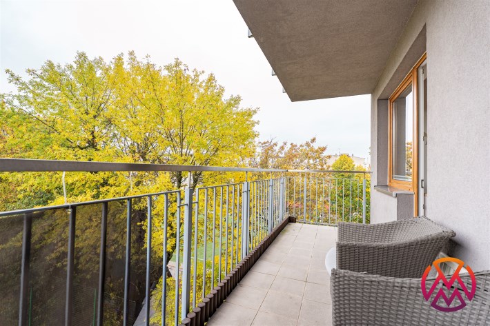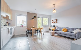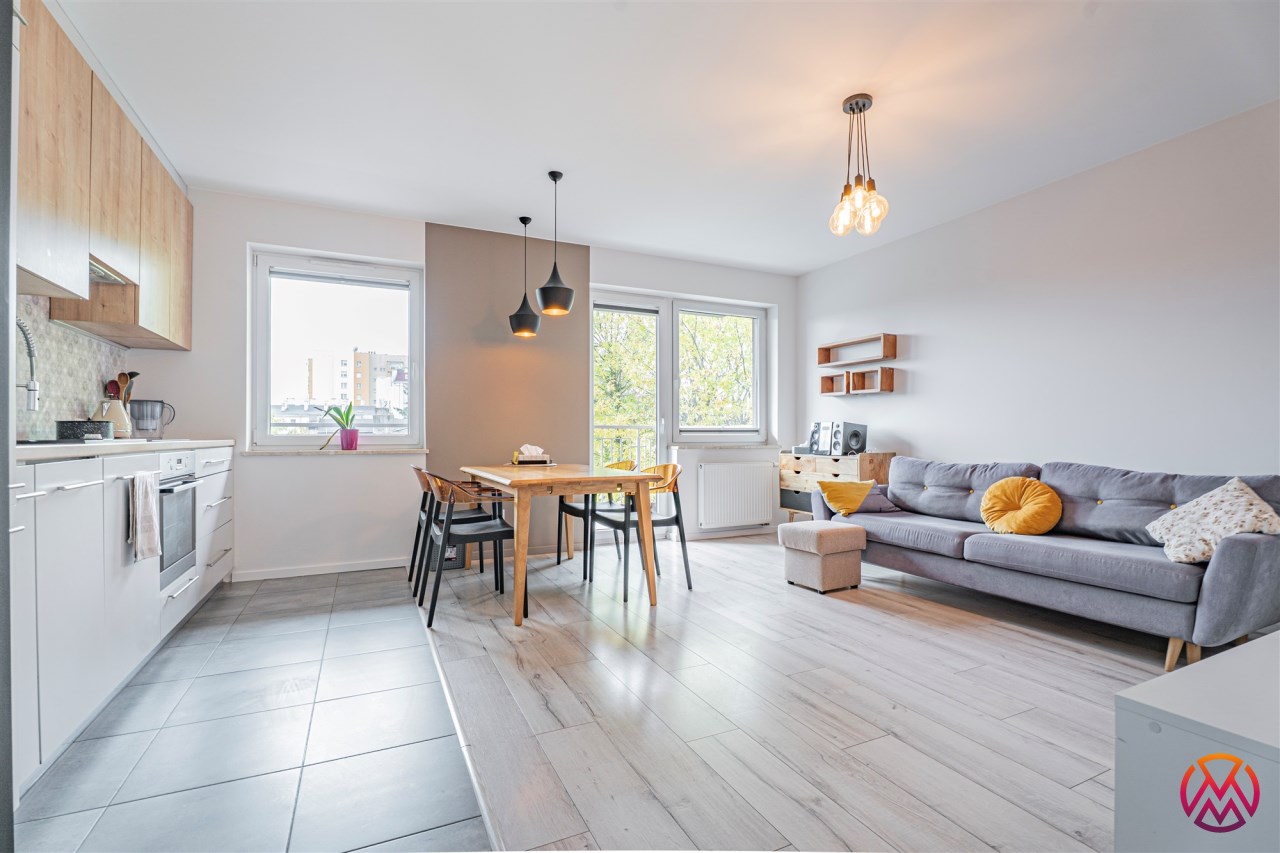 W salonie kanapa z funkcją spania, stolik, stół z krzesłami, szafka RTV oraz TV. Dodatkowo wyjście na duży balkon z widokiem na zieleń. Przy salonie aneks kuchenny, wyposażony w we wszystkie niezbędne sprzęty i meble. Wszystkie sprzęty (lodówka z zamrażarką, piekarnik, płyta indukcyjna, zmywarka) w bardzo dobrym stanie. Salon bardzo przestronny i dobrze nasłoneczniony. Sypialnia główna wyposażona w podwójne łóżka oraz szafę i komody. W drugiej sypialni znajdziemy rozkładaną kanapę oraz szafę. Łazienka przestronna, wyposażona w kabinę prysznicową z deszczownicą. Dodatkowo ogromne lustro, WC, umywalka i pralka. Łazienka urządzona w stylu komponującym się z resztą mieszkania. Dodatkowo oddzielne WC z umywalką. W przedpokoju funkcjonalna, duża szafa.