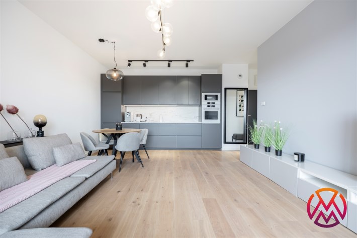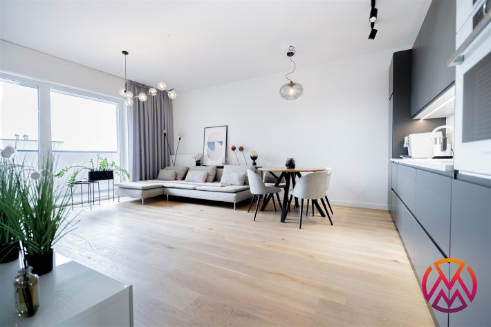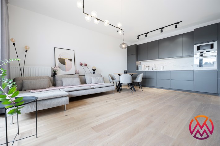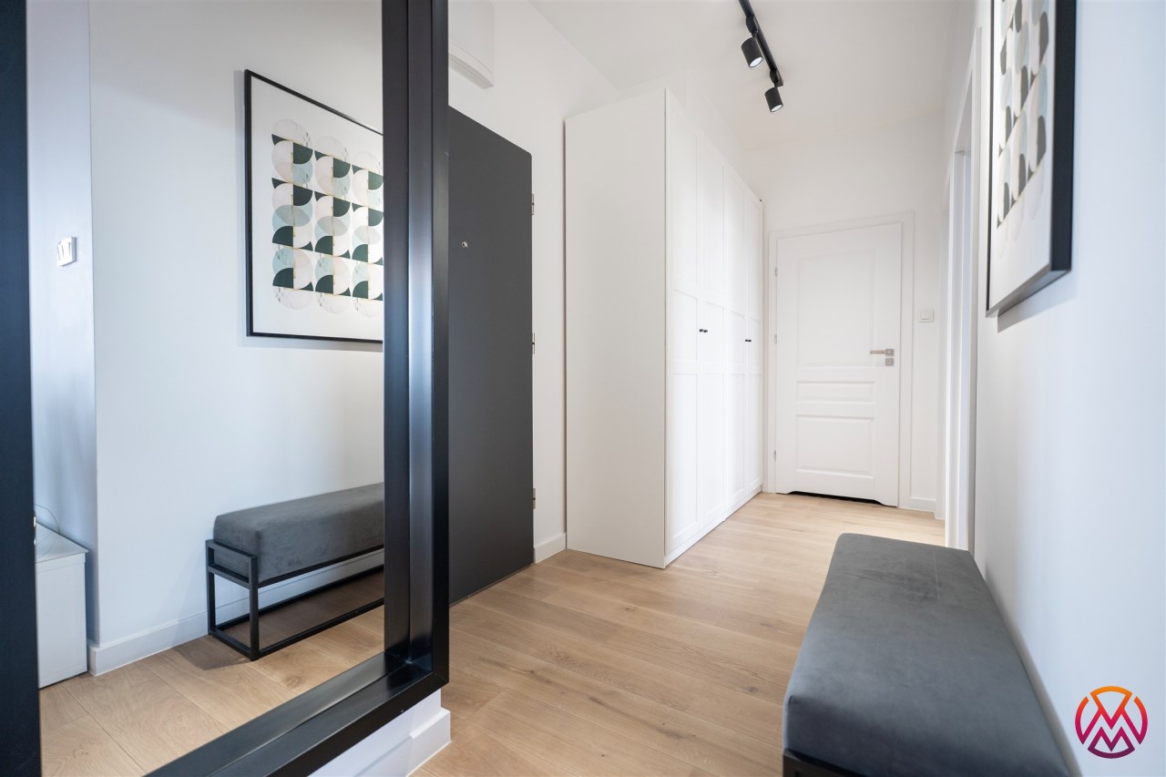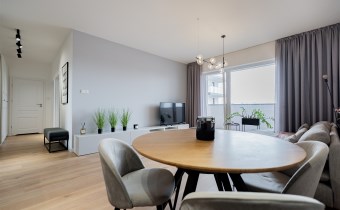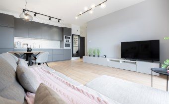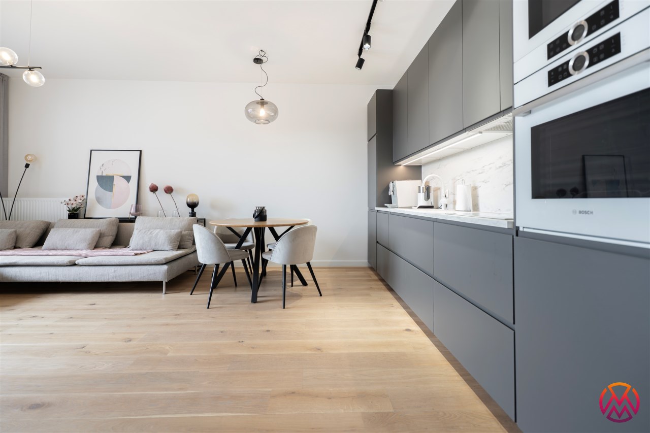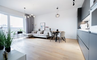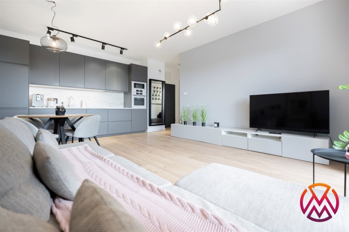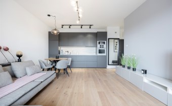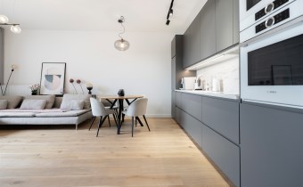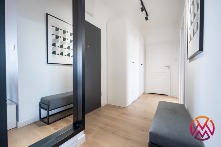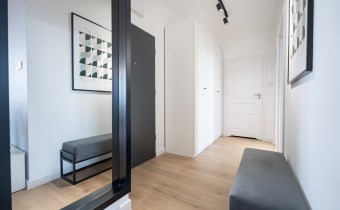 Mieszkanie zostało urządzone w nowoczesnym stylu z wykorzystaniem wysokiej jakości materiałów. Neutralna kolorystyka i przemyślana zabudowa nadają wnętrzu elegancji i harmonii.
