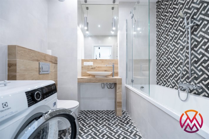W łazience znajduje się wanna z funkcją prysznica, pralka, toaleta, umywalka z szafką. W przedpokoju dodatkowo pakowna szafa.