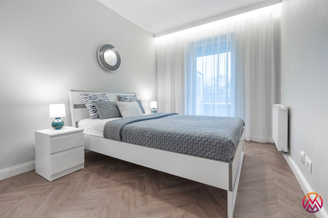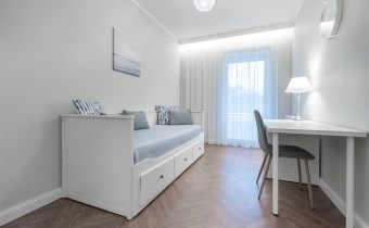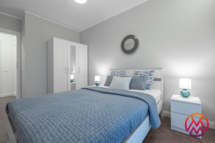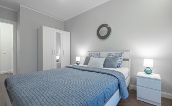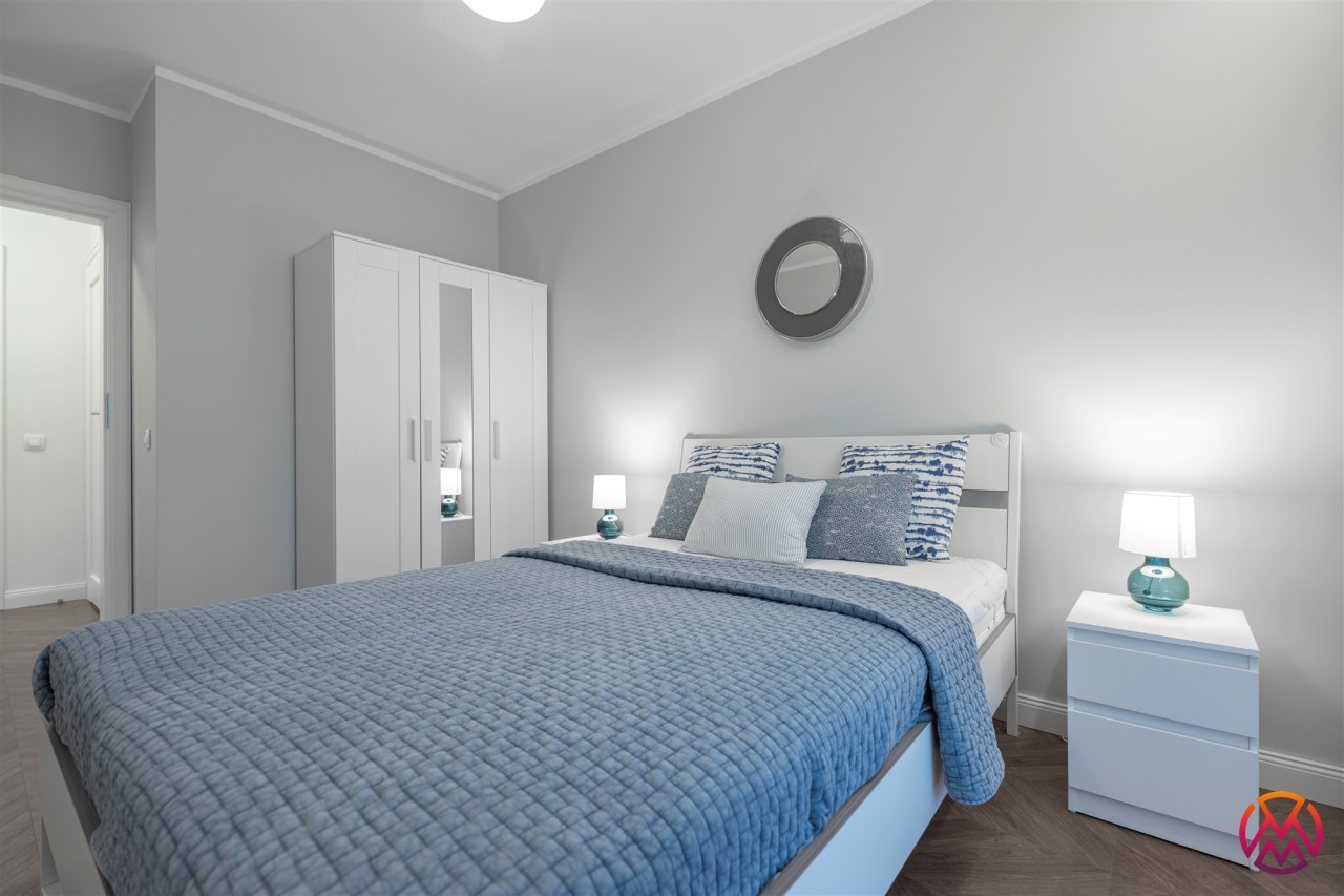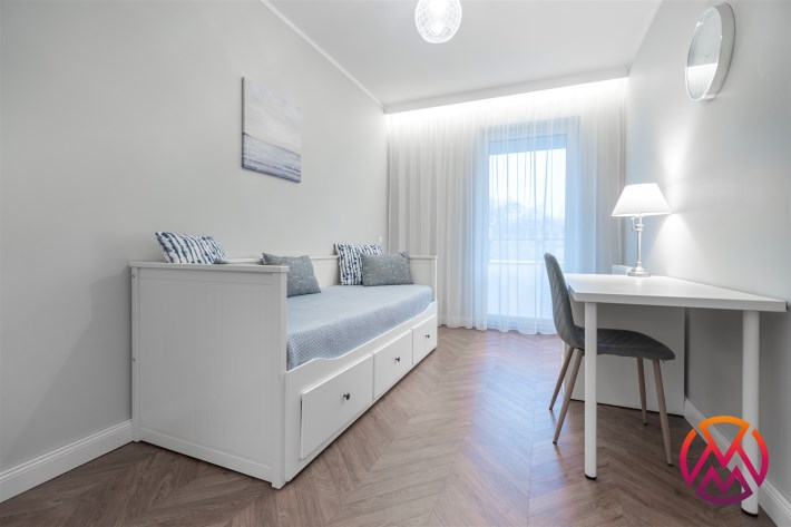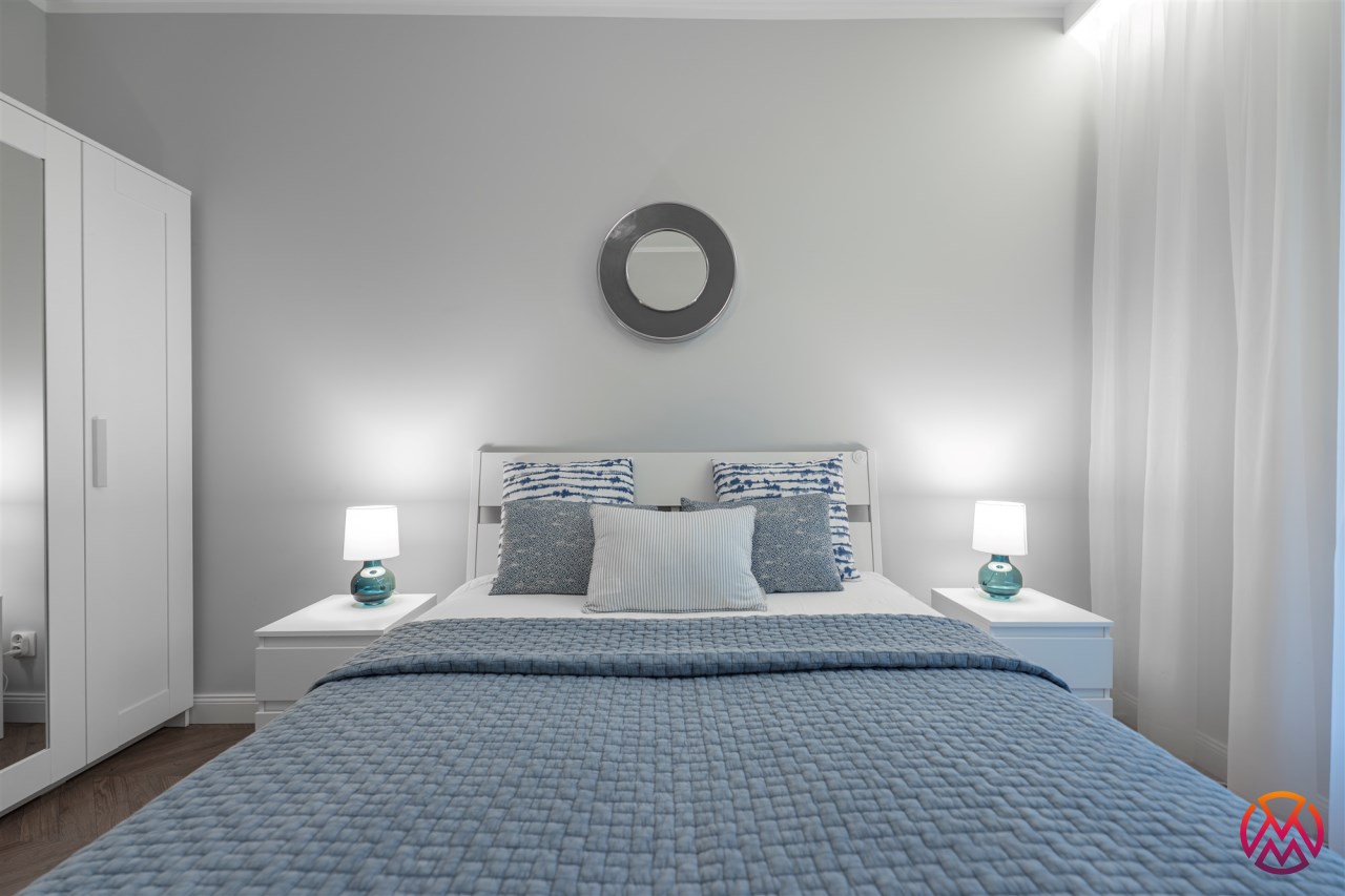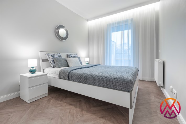 W pełni umeblowane i wyposażone. W salonie znajdziemy wygodny komplet wypoczynkowy, szafkę rtv z telewizorem, stół z krzesłami. Aneks kuchenny wyposażony został we wszystkie niezbędne sprzęty m.in. lodówko-zamrażarkę, zmywarkę, piekarnik, płytę indukcyjną, okap, komplet naczyń i sztućców. W głównej sypialni znajdziemy podwójne łóżko, szafę oraz stoliki nocne z oświetleniem. Drugi pokój może służyć jako druga sypialnia, bądź gabinet - wyposażony został w pojedyncze łóżko, biurko oraz szafę. Łazienka z prysznicem, toaletą, umywalką. Dodatkowo mieszkanie posiada funkcjonalne pomieszczenie gospodarcze z regałem. W przedpokoju pakowna szafa w zabudowie.
