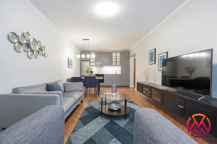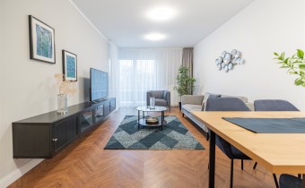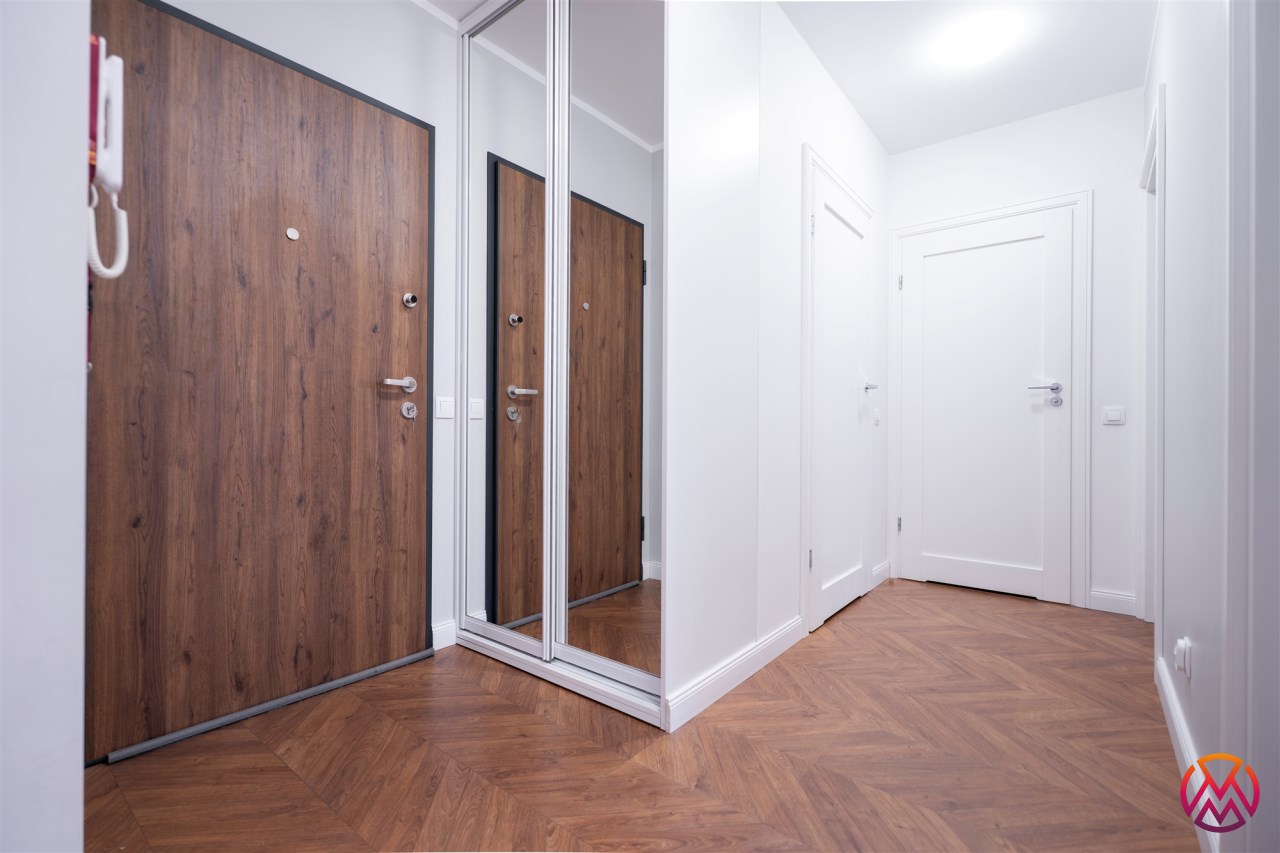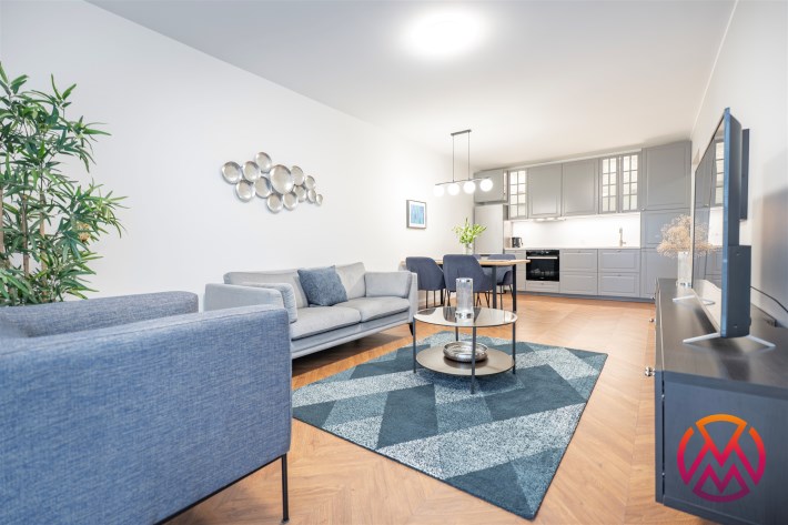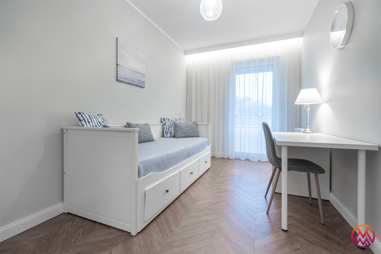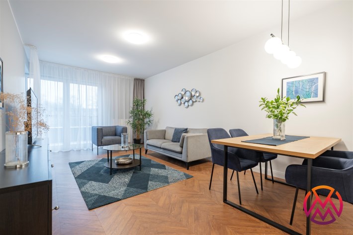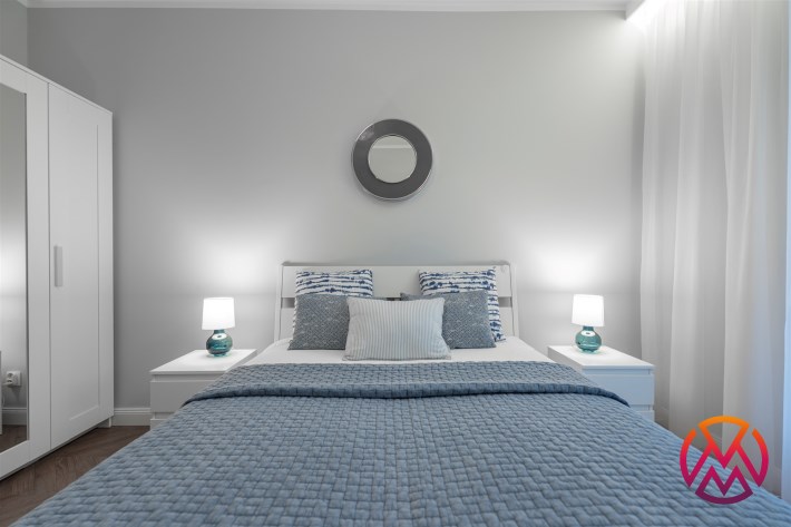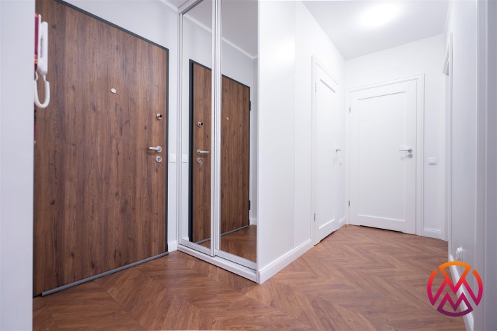 W pełni umeblowane i wyposażone. W salonie znajdziemy wygodny komplet wypoczynkowy, szafkę rtv z telewizorem, stół z krzesłami. Aneks kuchenny wyposażony został we wszystkie niezbędne sprzęty m.in. lodówko-zamrażarkę, zmywarkę, piekarnik, płytę indukcyjną, okap, komplet naczyń i sztućców. W głównej sypialni znajdziemy podwójne łóżko, szafę oraz stoliki nocne z oświetleniem. Drugi pokój może służyć jako druga sypialnia, bądź gabinet - wyposażony został w pojedyncze łóżko, biurko oraz szafę. Łazienka z prysznicem, toaletą, umywalką. Dodatkowo mieszkanie posiada funkcjonalne pomieszczenie gospodarcze z regałem. W przedpokoju pakowna szafa w zabudowie.