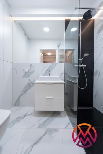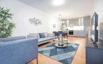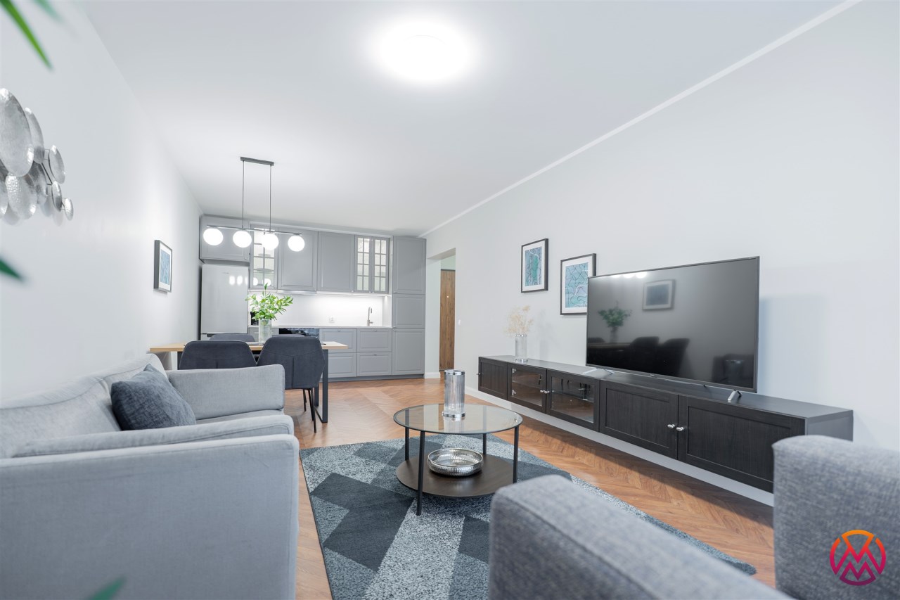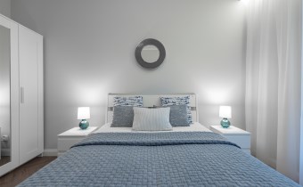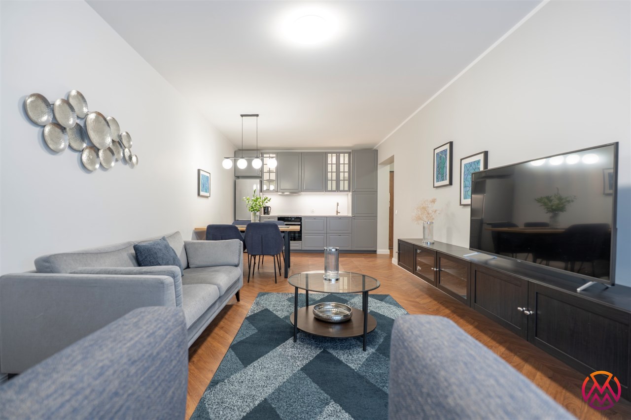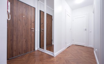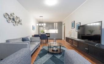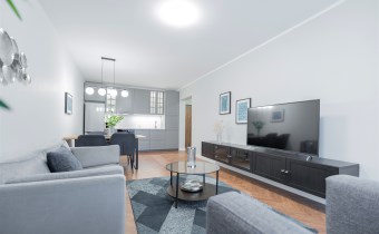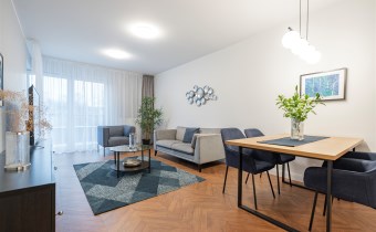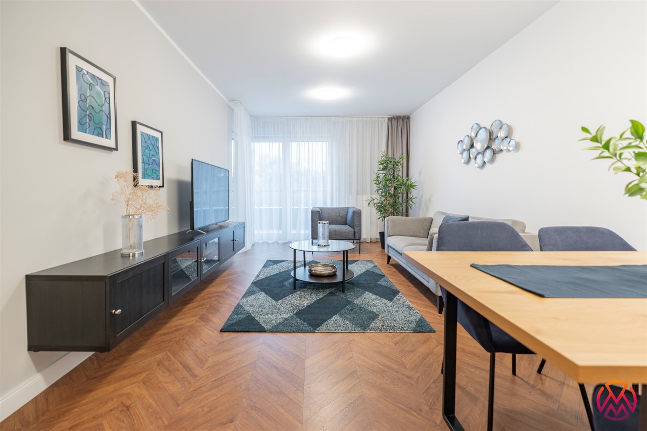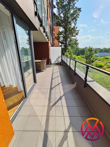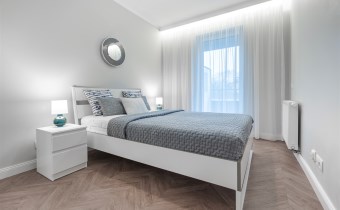 W pełni umeblowane i wyposażone. W salonie znajdziemy wygodny komplet wypoczynkowy, szafkę rtv z telewizorem, stół z krzesłami. Aneks kuchenny wyposażony został we wszystkie niezbędne sprzęty m.in. lodówko-zamrażarkę, zmywarkę, piekarnik, płytę indukcyjną, okap, komplet naczyń i sztućców. W głównej sypialni znajdziemy podwójne łóżko, szafę oraz stoliki nocne z oświetleniem. Drugi pokój może służyć jako druga sypialnia, bądź gabinet - wyposażony został w pojedyncze łóżko, biurko oraz szafę. Łazienka z prysznicem, toaletą, umywalką. Dodatkowo mieszkanie posiada funkcjonalne pomieszczenie gospodarcze z regałem. W przedpokoju pakowna szafa w zabudowie.
