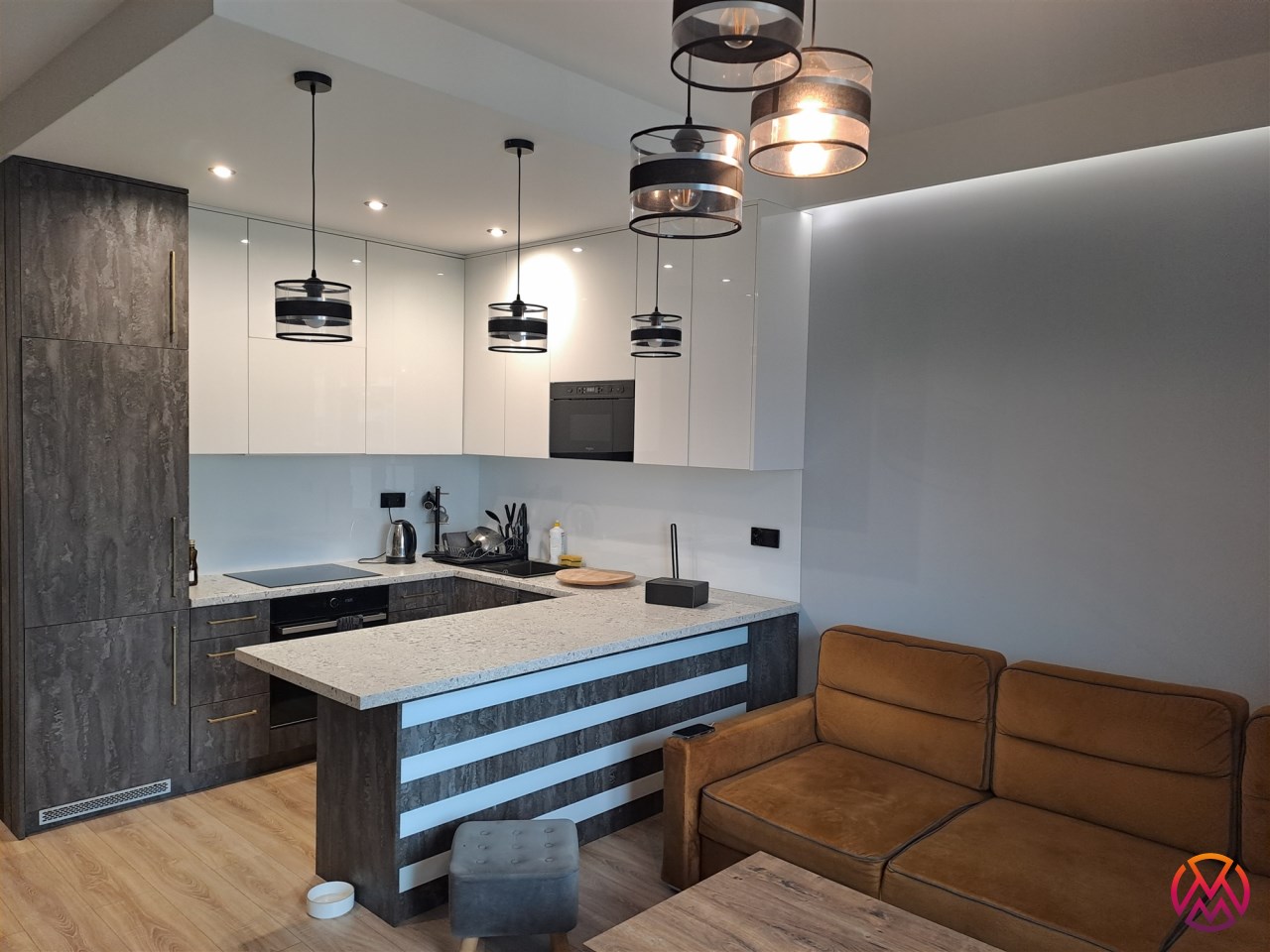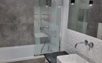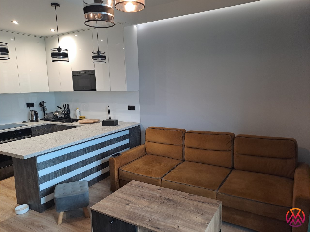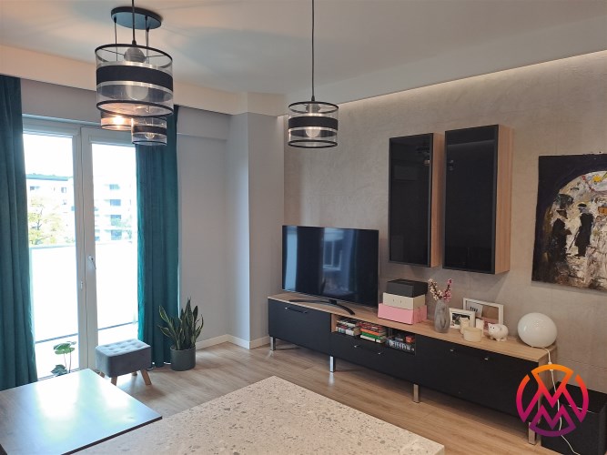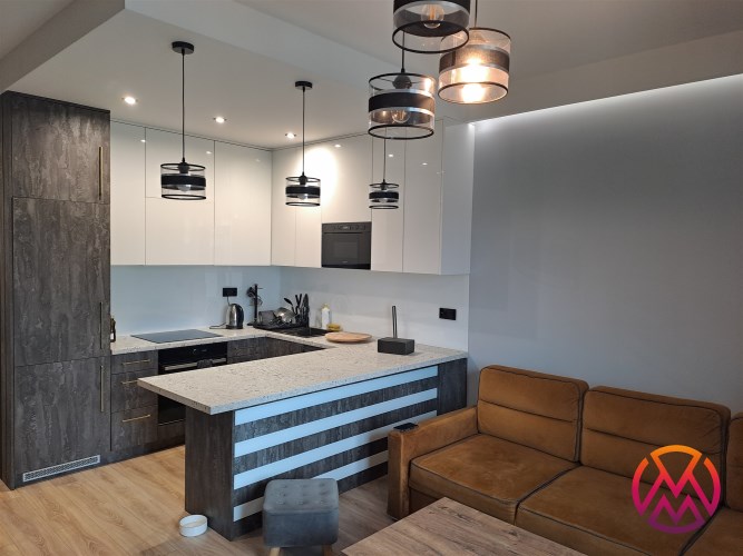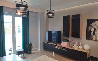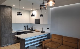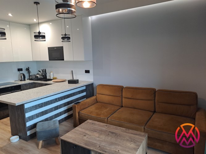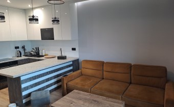 Apartament został wykończony w nowoczesny, niebanalny sposób przez architekta. W salonie znajdziemy wygodną rozkładaną kanapę, stolik kawowy, szafkę RTV, telewizor. Aneks kuchenny wyposażony w lodówko-zamrażarkę, zmywarkę, piekarnik, płytę indukcyjną, kuchenkę mikrofalową.