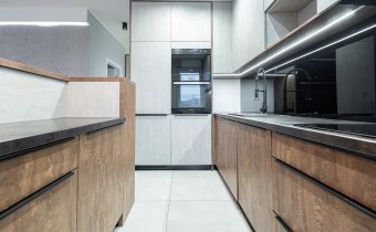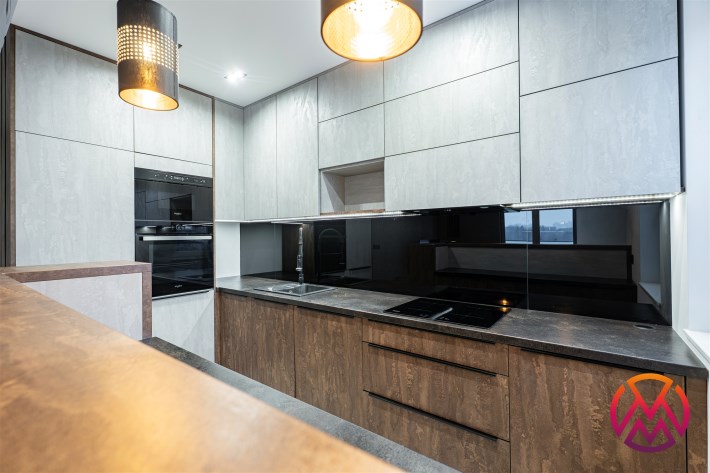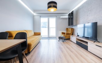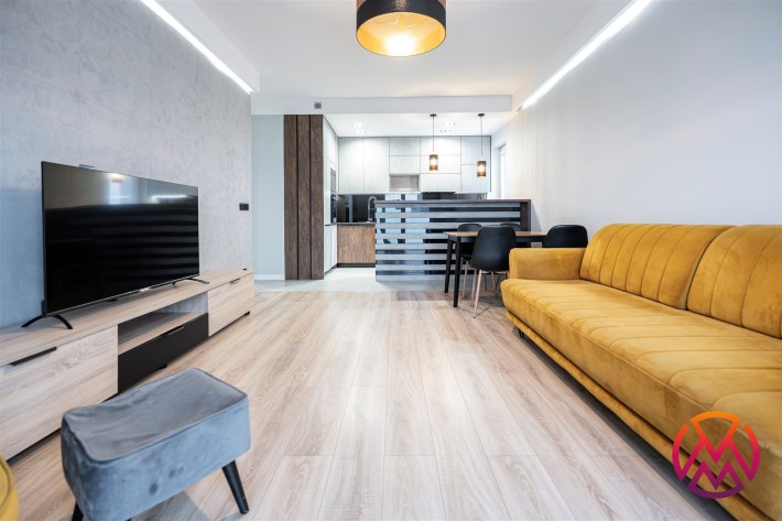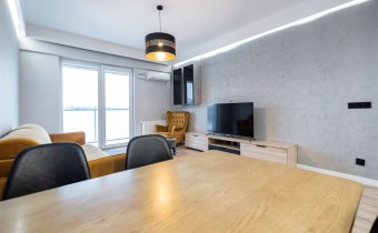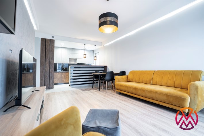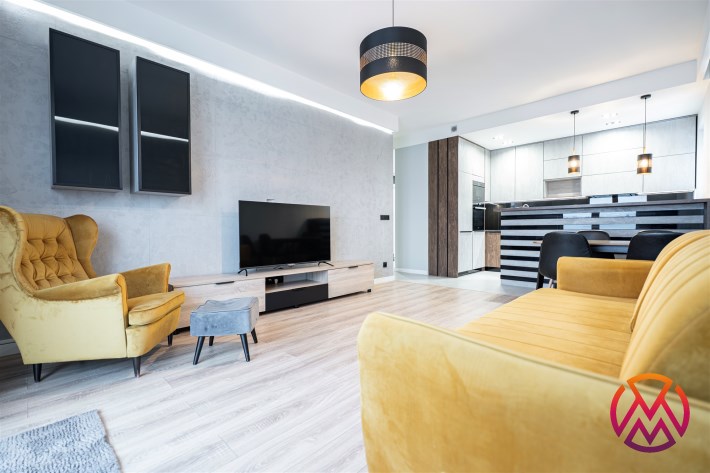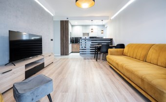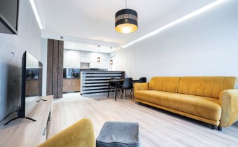 Apartament został wykończony w nowoczesny, niebanalny sposób przez architekta. W salonie znajdziemy wygodną kanapę, stolik kawowy, szafkę RTV, telewizor oraz stół z krzesłami. Aneks kuchenny wyposażony w lodówko-zamrażarkę, zmywarkę, piekarnik, płytę indukcyjną.