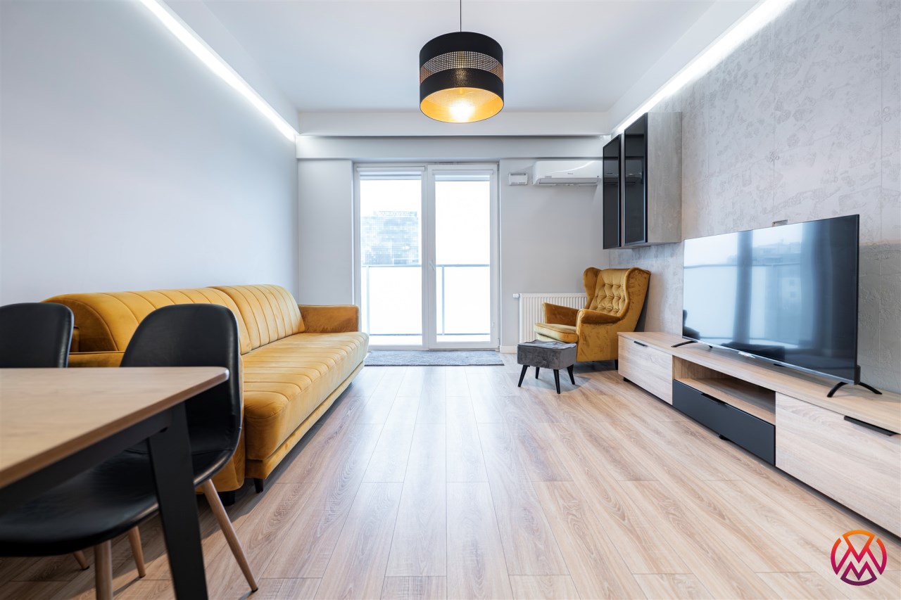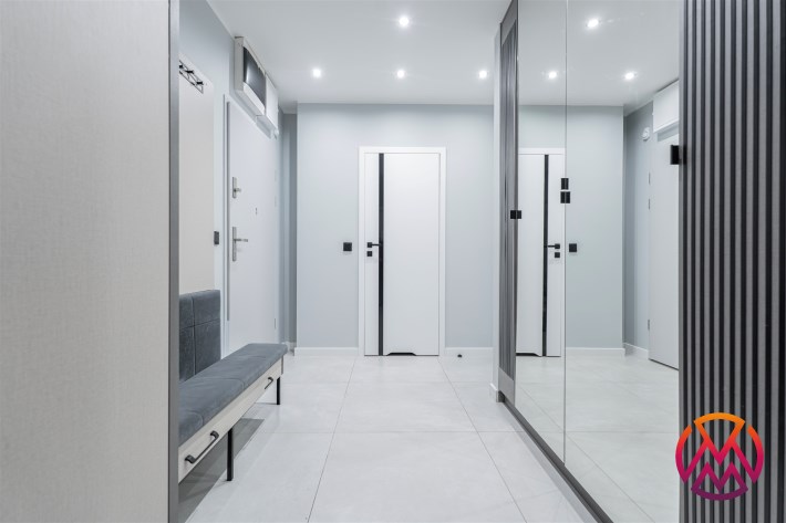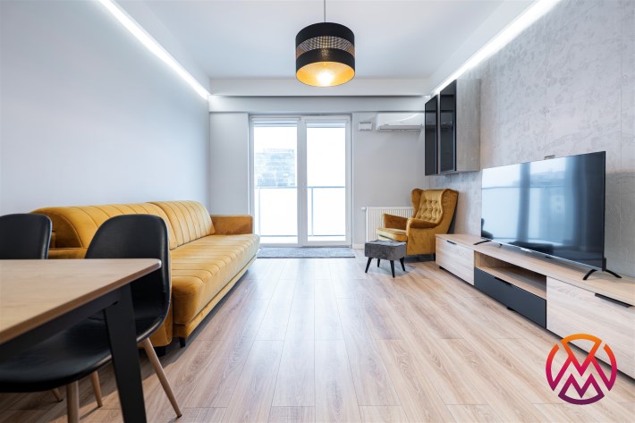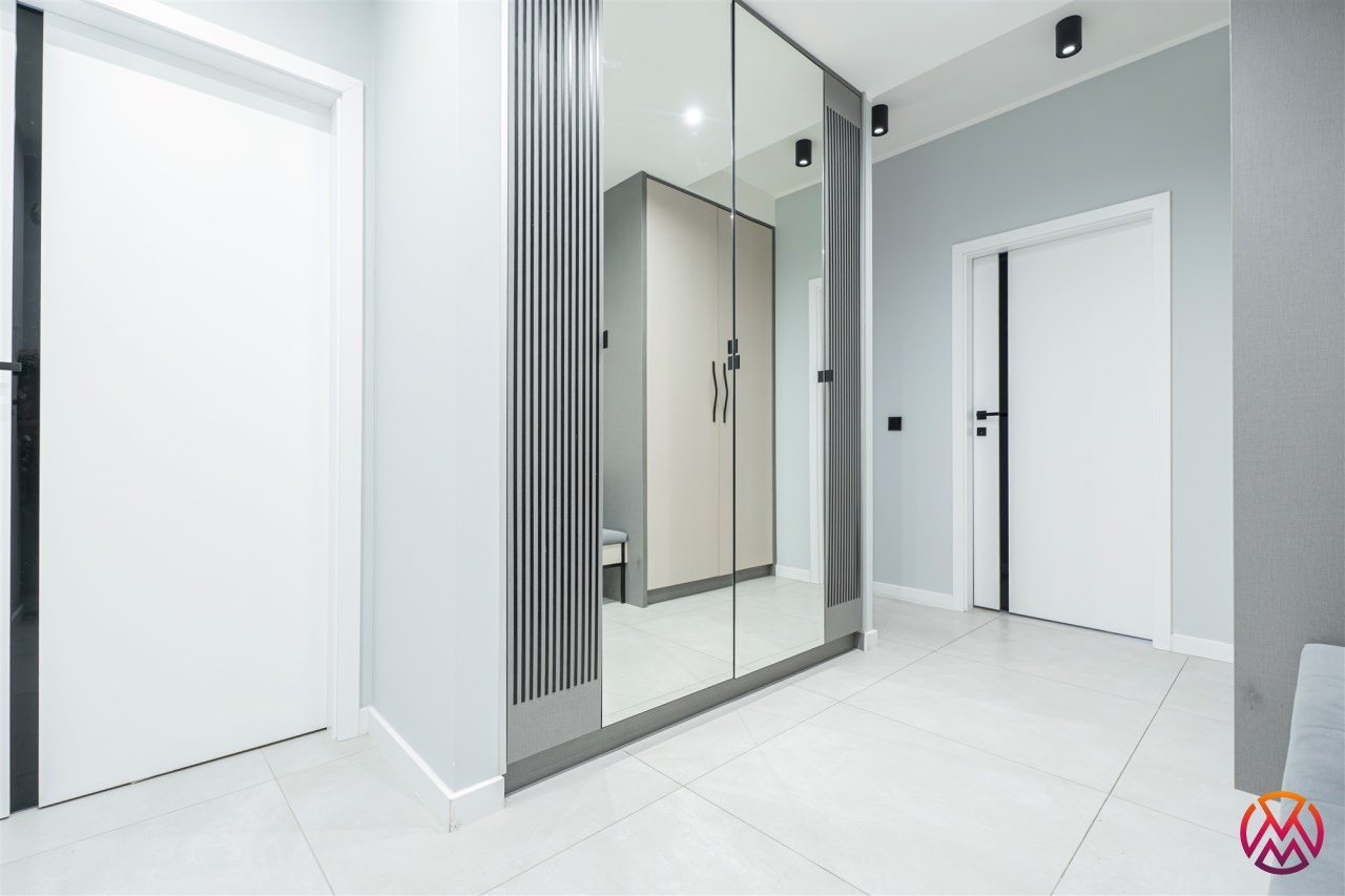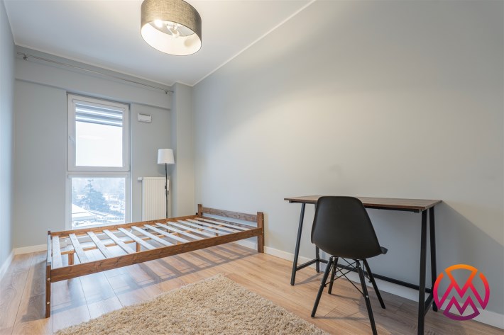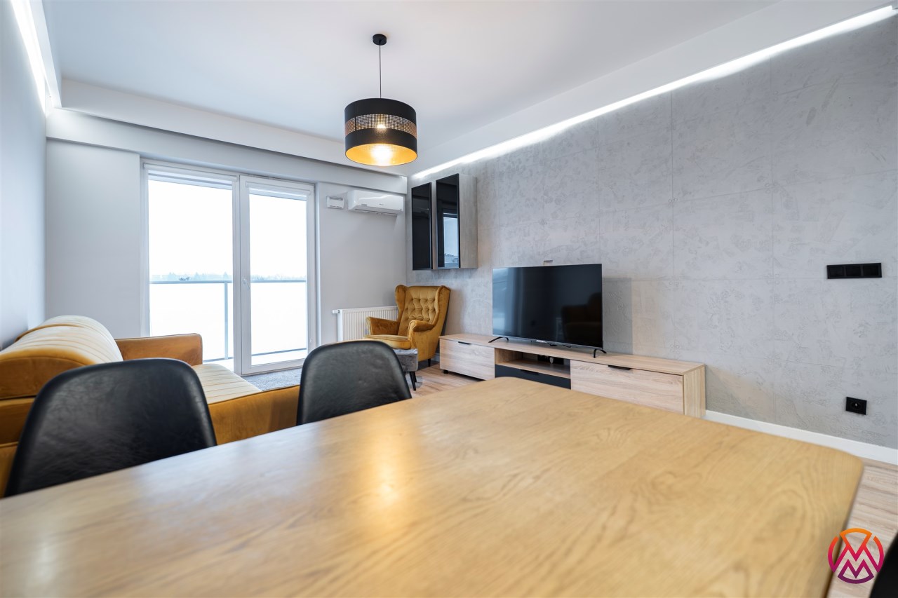 Apartament składa się z 3 pokoi: salonu z aneksem kuchennym, 2 sypialni, łazienki razem z WC oraz przedpokoju. Dodatkowym atutem jest przestronny taras z widokiem na panoramę miasta. Całość wykończona bardzo gustownie przy użyciu materiałów wysokiej jakości. Mieszkanie klimatyzowane. Na terenie osiedla znajduje się rowerownia.