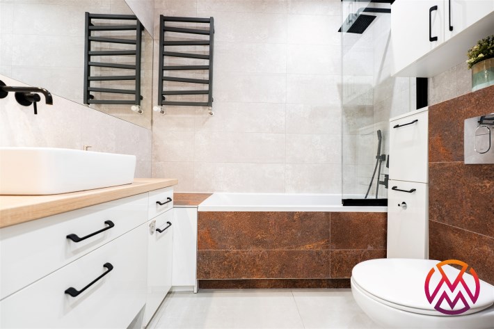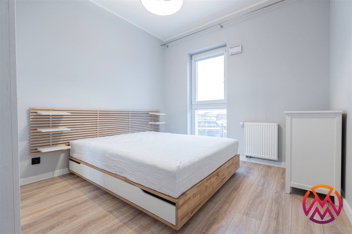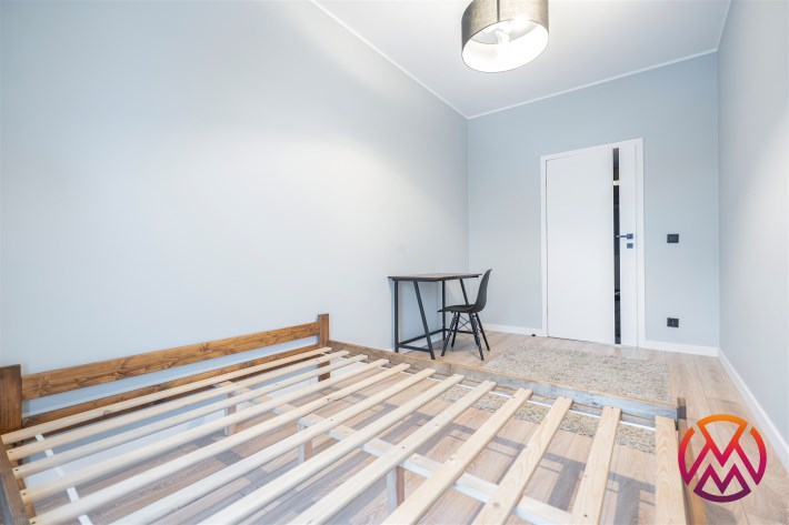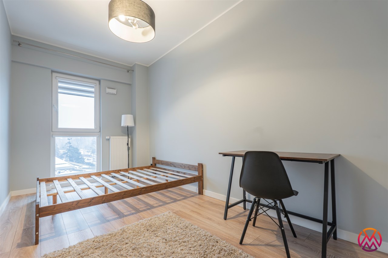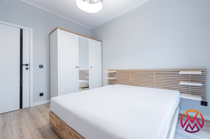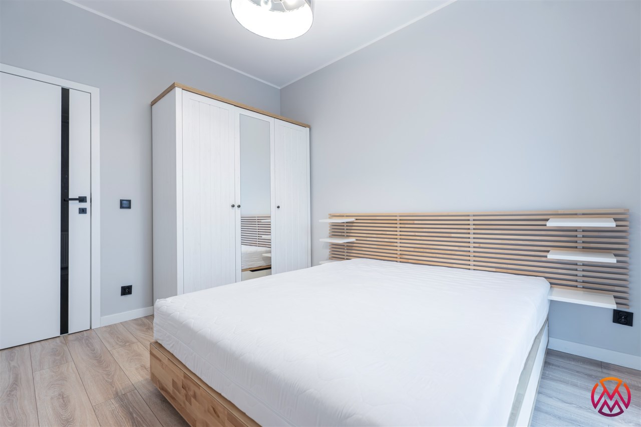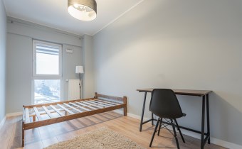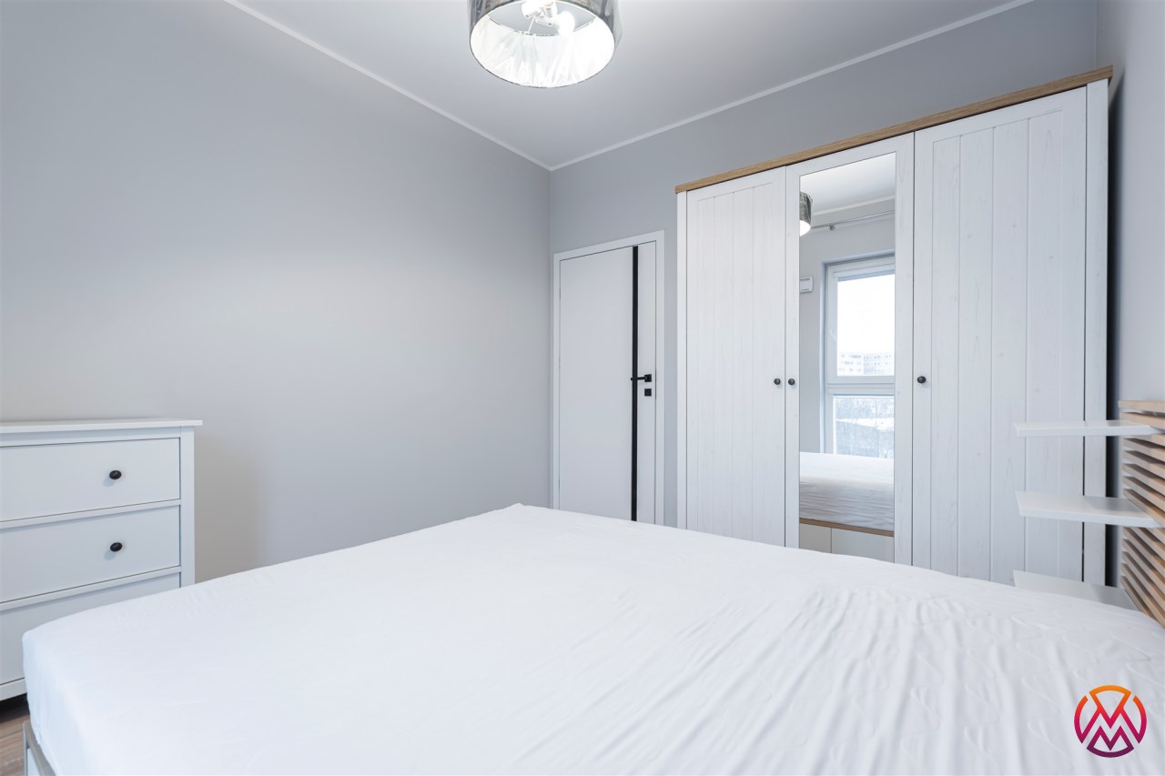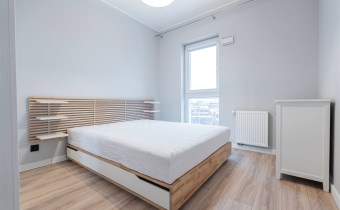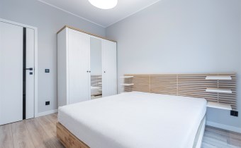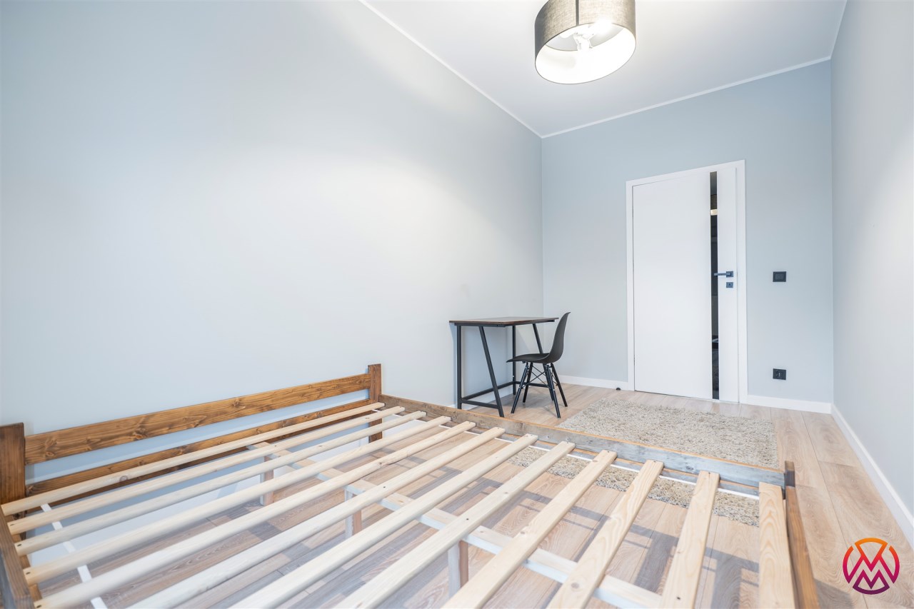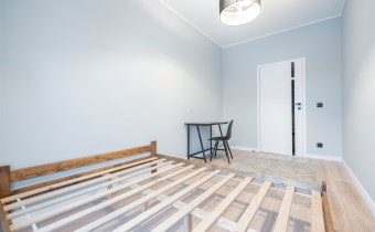 W sypialni znajduje się dwuosobowe łóżko oraz szafa stojąca. Drugi pokój może zostać zaadaptowany przez najemcę na gabinet. Toaleta z wanną z funkcją prysznica, umywalką, pralką oraz WC. Dodatkowo w przedpokoju znajduje się pakowna szafa z siedziskiem i licznym miejscem do przechowywania.