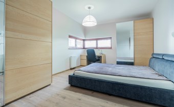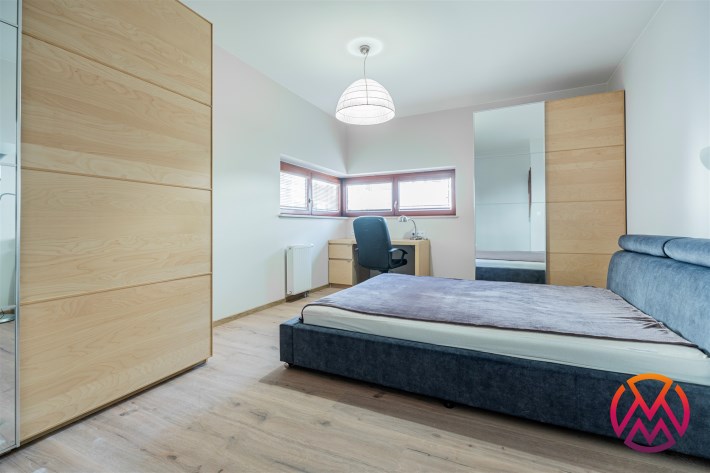 Sypialnia z dużym i wygodnym łóżkiem, pakowną szafą, oraz dużym biurkiem do pracy zdalnej.