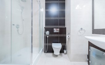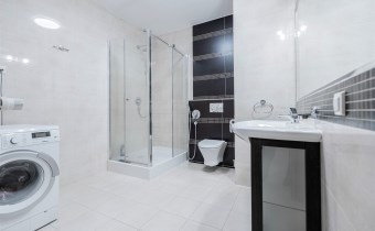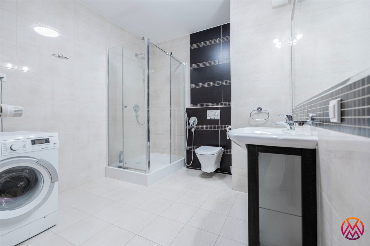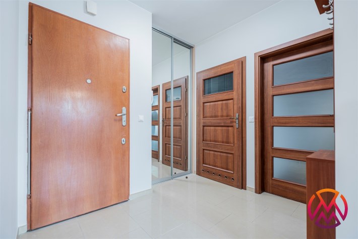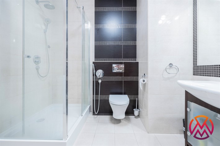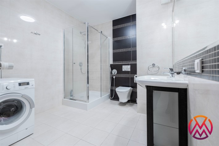 Łazienka z prysznicem, pralką, umywalką i WC. W przedpokoju pojemna szafa komandor na zimową odzież, akcesoria gospodarcze itp.