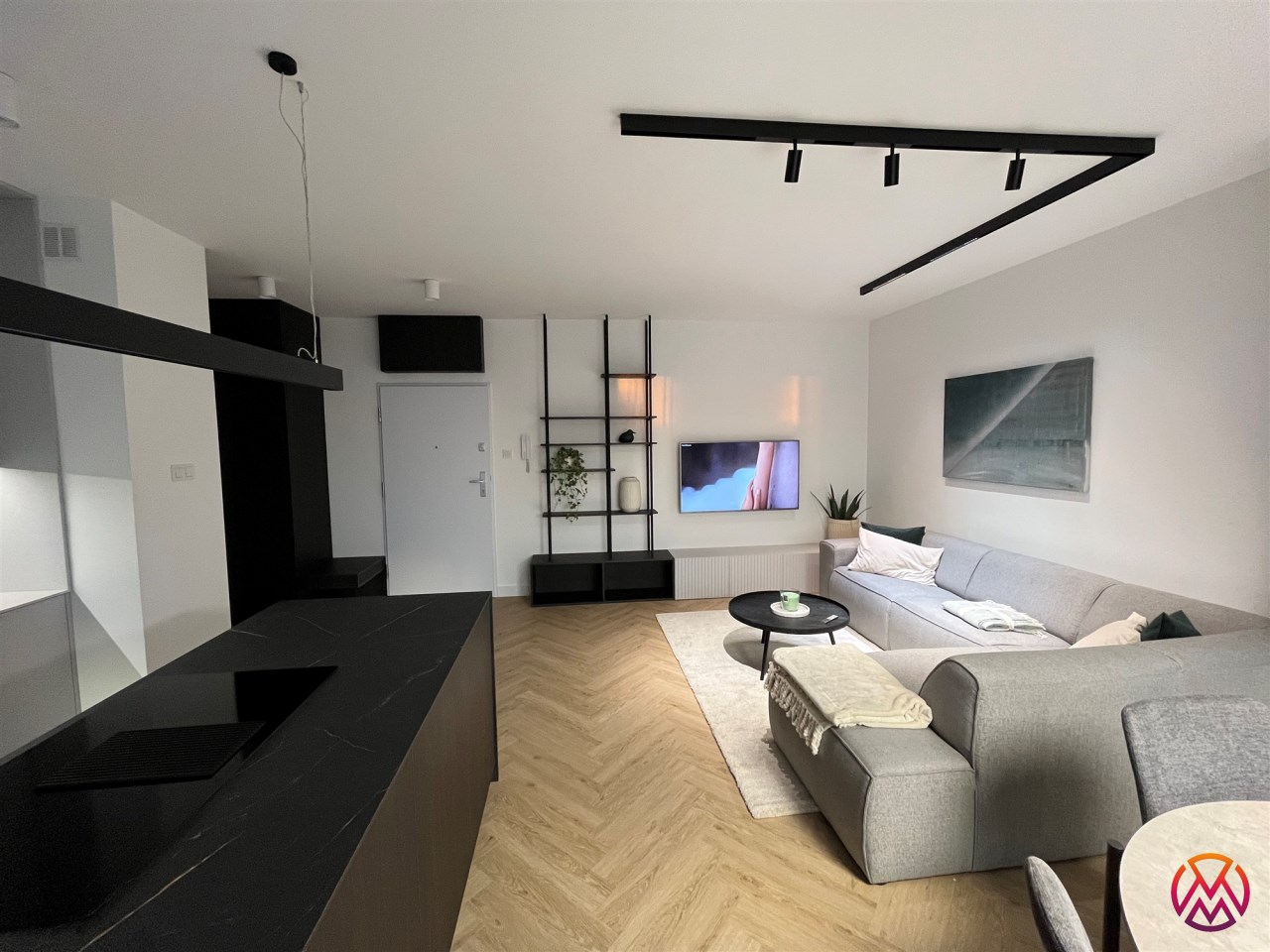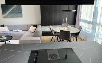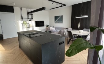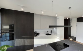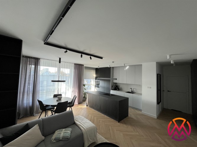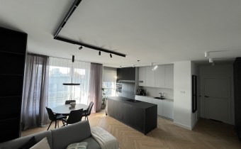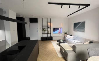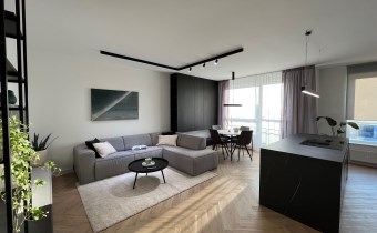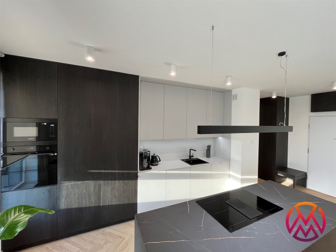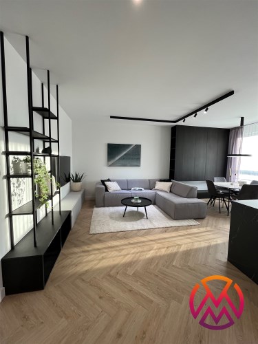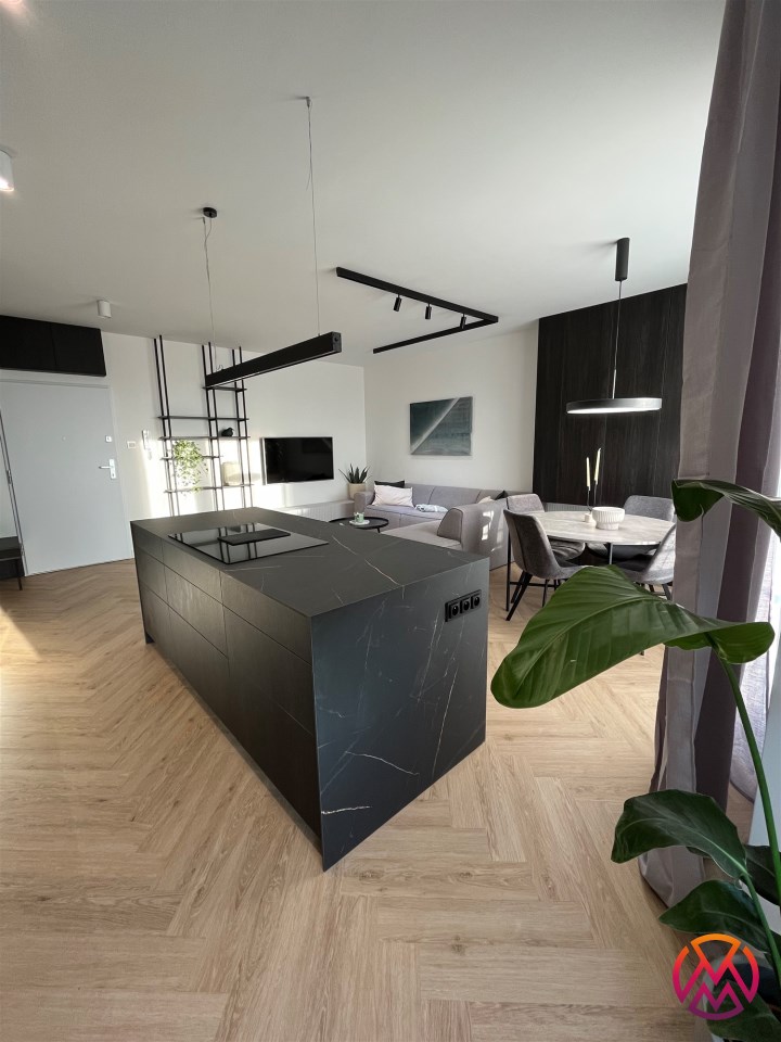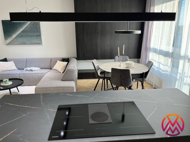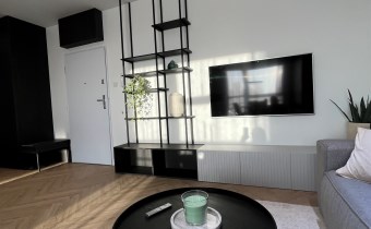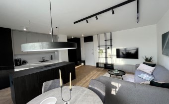 Przestronny salon umeblowany został w wygodną kanapę, stół z krzesłami, szafkę RTV, telewizor Samsung 55'. Aneks kuchenny wyposażony we wszystkie niezbędne sprzęty (zmywarka, płyta indukcyjna, kuchenka mikrofalowa, piekarnik elektryczny, lodówko-zamrażarka, ekspres do kawy DeLonghi). Sypialnia z wygodnym podwójnym łóżkiem, pakowną szafą oraz komfortowym miejscem do pracy. Łazienka z dużym prysznicem typu walk-in, umywalką i WC. Dodatkowo w przedpokoju znajduje się oraz pojemna szafa.