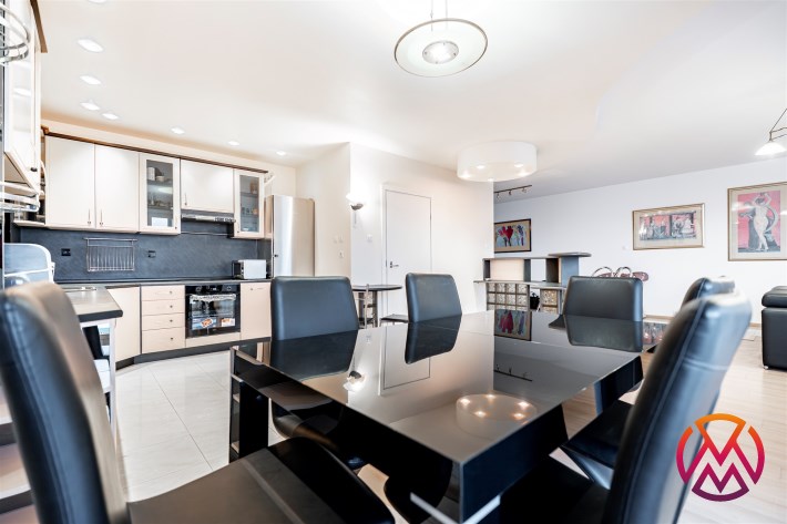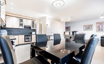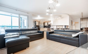 Apartament jest wyposażony i gotowy do zamieszkania. W salonie znajdziemy wygodny, skórzany komplet wypoczynkowy, szafkę RTV, barek z krzesłami, stół rozkładany z krzesłami. Kuchnia w pełni wyposażona - lodówka, zmywarka, piekarnik, płyta indukcyjna, okap. W pomieszczeniu gospodarczym znalazły miejsce liczne regały oraz pralka. Główna sypialnia posiada duże, małżeńskie łóżko (z możliwością doposażenia o materac), pakowną szafę w zabudowie oraz szafki nocne. Pozostałe dwie sypialnie do indywidualnego uzgodnienia wyposażenia.