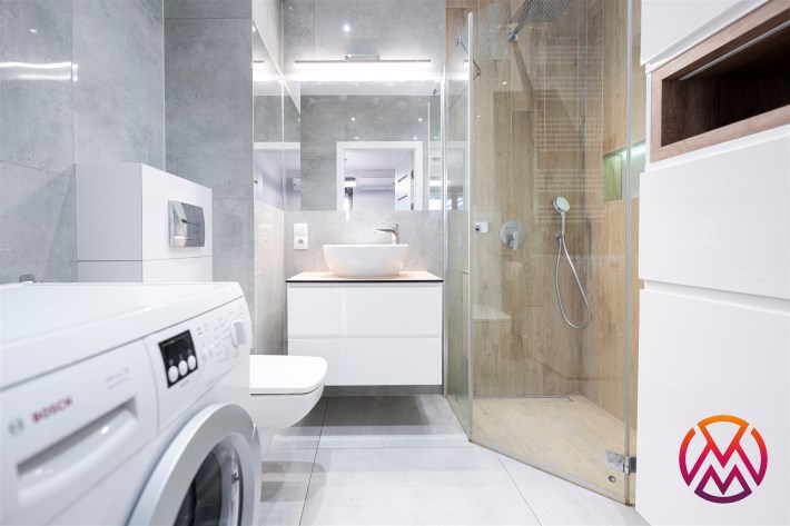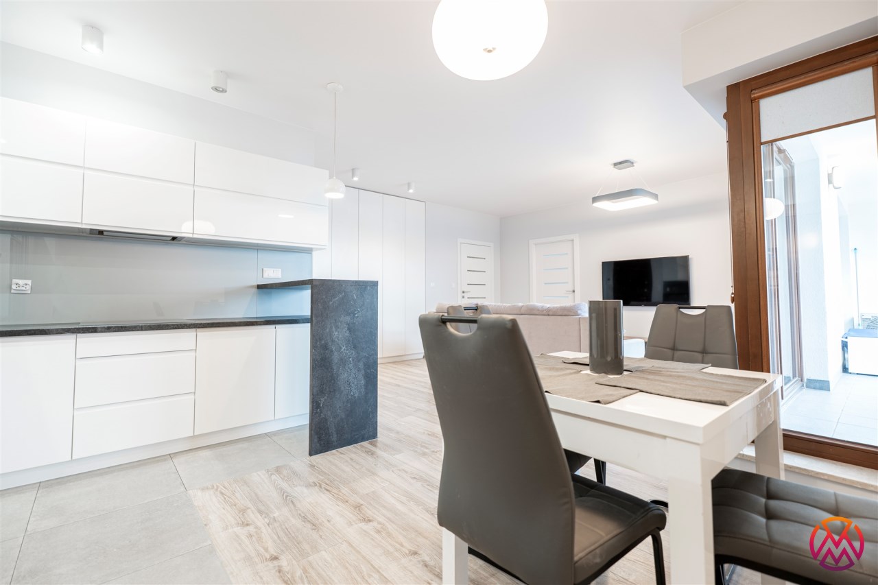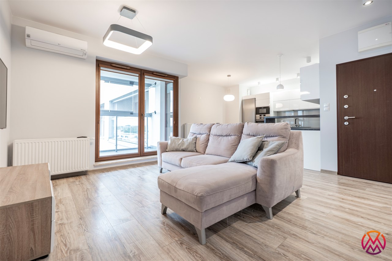 Mieszkanie jest w pełni umeblowane i wyposażone, gotowe do zamieszkania od zaraz. Składa się z jasnego salonu z aneksem kuchennym, oddzielnej sypialni, eleganckiej łazienki oraz balkonu. Kuchnia z jadalnią i łazienka są kompletnie wyposażone w sprzęt AGD (w tym pralka, lodówka, zmywarka), a w pokojach znajdują się wszystkie niezbędne meble.
