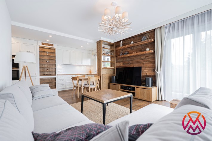 Mieszkanie o przemyślanym rozkładzie, mieści się w nowoczesnym apartamentowcu i charakteryzuje się bardzo wysokim standardem wykończenia. Wnętrza są niezwykle przytulne i komfortowe, a to za sprawą dominujących elementów drewnianych oraz eleganckiej drewnianej podłogi, ze specjalnie suszonego, ponad 100-letniego drewna, które nadają wnętrzom ciepła i klasy.