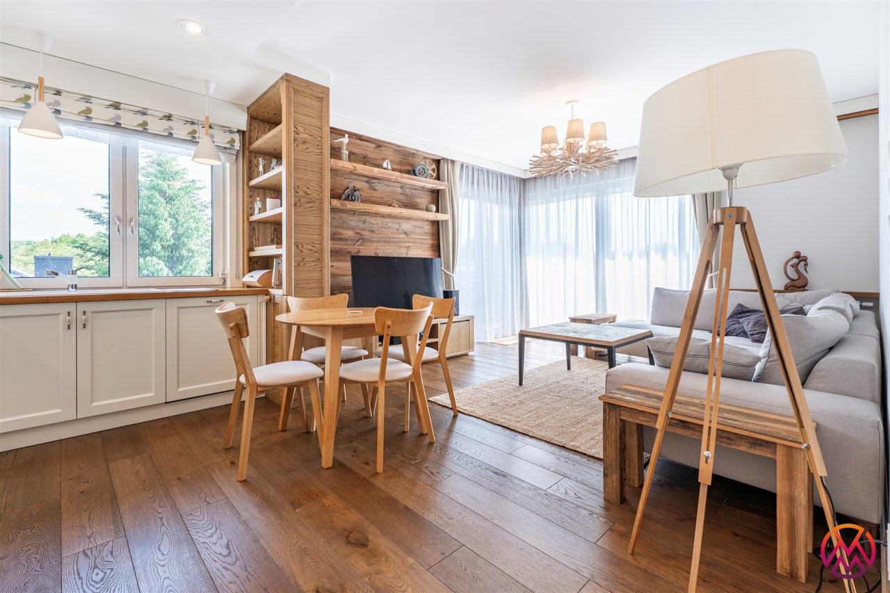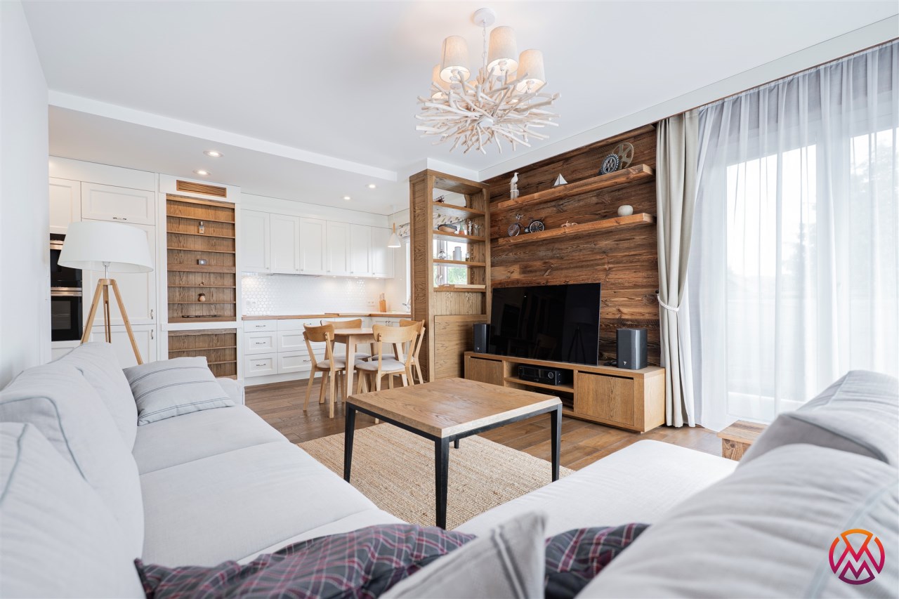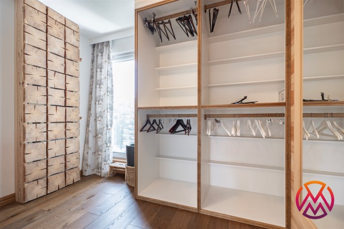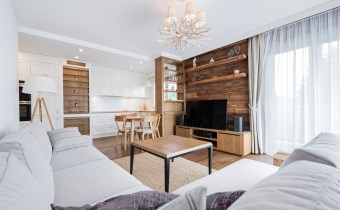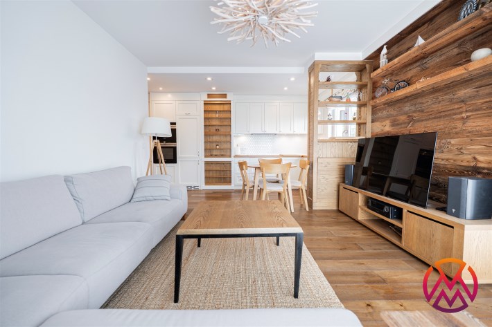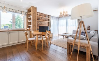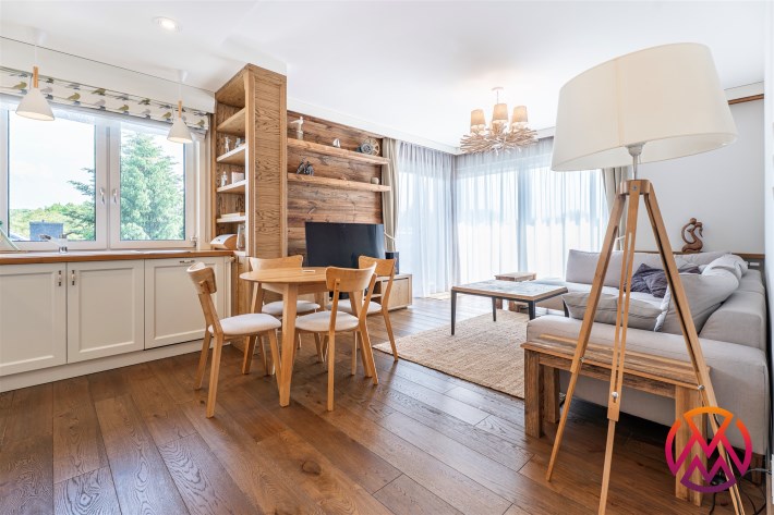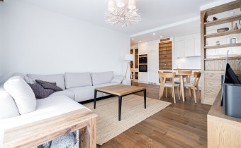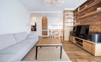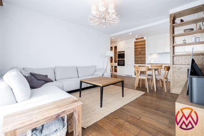 Mieszkanie o przemyślanym rozkładzie, mieści się w nowoczesnym apartamentowcu i charakteryzuje się bardzo wysokim standardem wykończenia. Wnętrza są niezwykle przytulne i komfortowe, a to za sprawą dominujących elementów drewnianych oraz eleganckiej drewnianej podłogi, ze specjalnie suszonego, ponad 100-letniego drewna, które nadają wnętrzom ciepła i klasy.